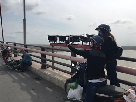 Tại cầu Cần Thơ, có hàng trăm phương tiện xe gắn máy dừng lại ngắm cảnh và chụp ảnh mặc dù trên lan can ở 2 bên đều có gắn bảng cấm tụ tập, buôn bán trên cầu.
