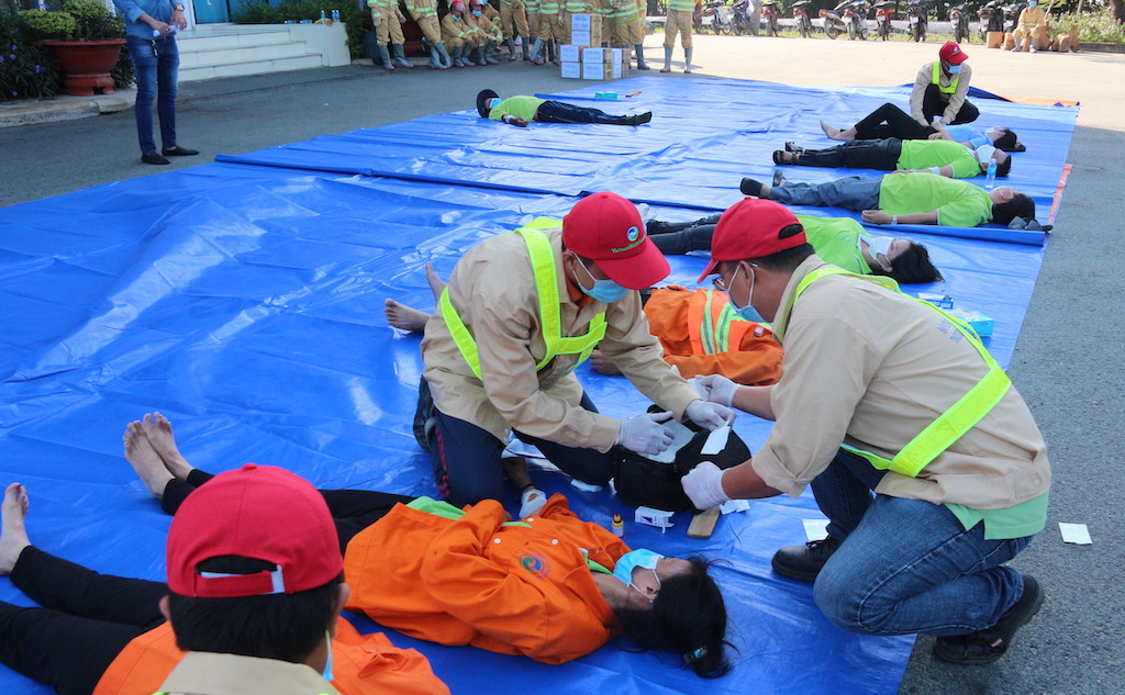 Cảnh sát phòng cháy chữa cháy - Công an huyện Bình Chánh huy động 24 cán bộ chiến sĩ cùng 1 xe chỉ huy, 2 xe chữa cháy chuyên dùng, triển khai mỗi xe 4 lăn phun B phun nước vào khu vực cháy giả định. Bên ngoài công ty, Công an xã Đa Phước phối hợp điều tiết giao thông trên Quốc lộ 50.