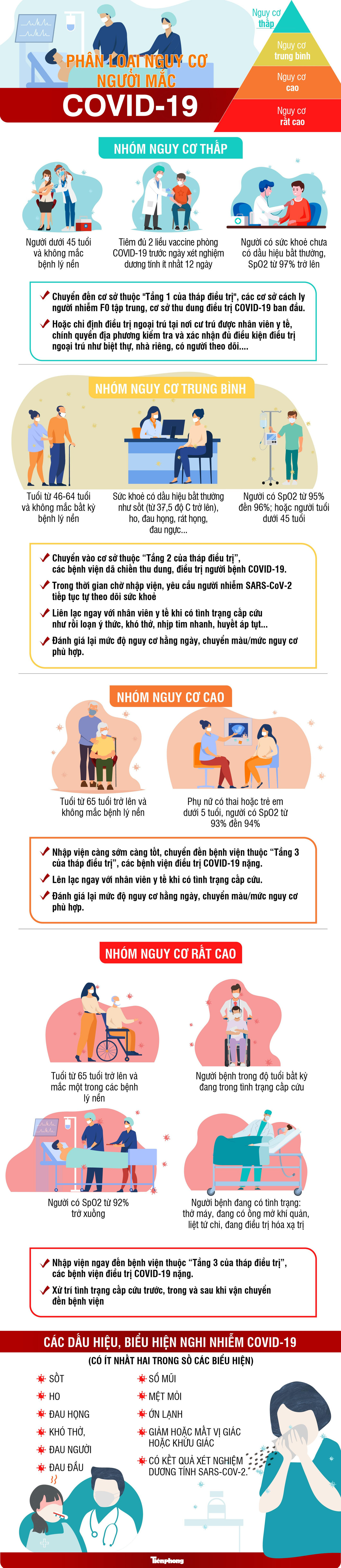 TPO - Bộ Y tế vừa ban hành quyết định về tiêu chí phân loại nguy cơ người nhiễm SARS-CoV-2. Tiêu chí trên được chia làm 4 loại tương ứng với từng màu sắc khác nhau: Màu xanh là mức nguy cơ thấp, màu vàng là nguy cơ trung bình, màu cam là nguy cơ cao và màu đỏ là nguy cơ rất cao.