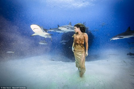 Bộ ảnh được thực hiện tại một khu bảo tồn cá mập của Bahamas và nhằm mục đích gửi đi thông điệp nhằm nêu cao nhận thức bảo vệ loài cá mập, trước thực trạng số lượng của cá mập ngày càng giảm.
