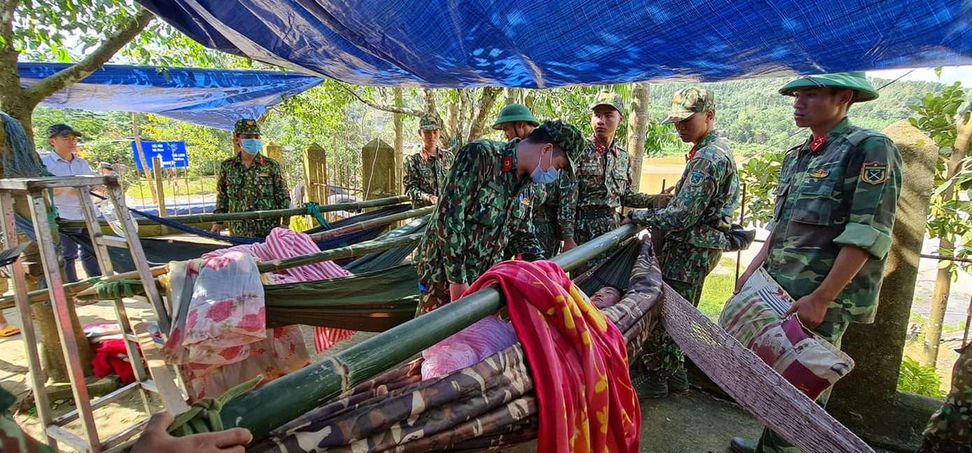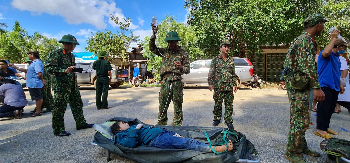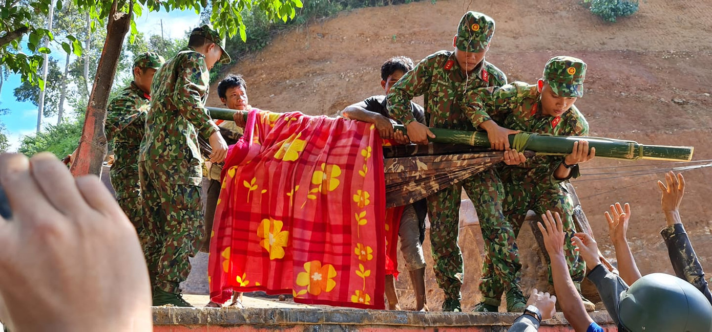 Trong số 43 người bị vùi lấp vì sạt lở ở xã Trà leng, Nam Trà My, tỉnh Quảng Nam có nhiều người bị thương rất nặng, nhiều người trong tình trạng nguy kịch. Những người dân này được khiêng ra ngoài để cấp cứu.
