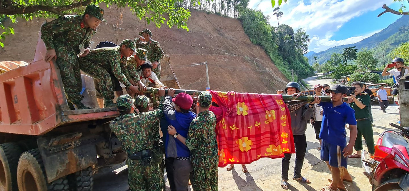 Lúc 15h chiều 29/10, sau khi một số nạn nhân bị thương trong vụ sạt lở núi Trà Leng được người dân cáng từ hiện trường ra, lực lượng chức năng khẩn trương đưa các nạn nhân đi cấp cứu.