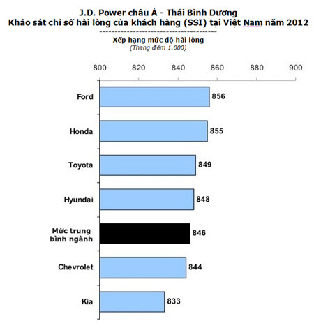 Mức độ hài lòng của khách hàng được chấm theo thang điểm 1.000, hãng nào có điểm cao hơn cho thấy mức độ thỏa mãn khách mua xe mới tốt hơn. Kết quả khảo sát năm nay, mức trung bình ngành là 846 điểm, giảm 15 điểm so với năm 2011. Điểm cụ thể của từng hãng như sau: