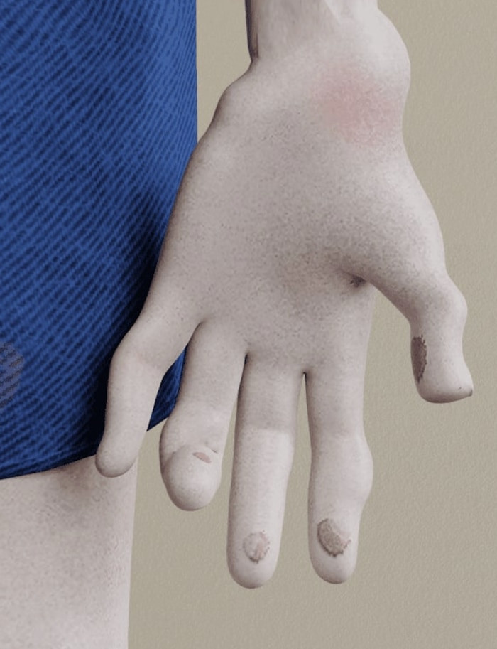 Do thao tác với bàn phím cùng bấm chuột thường xuyên nên phần da ở đầu ngón tay bị chai đi nhiều và xương ngón tay cũng trở nên biến dạng. Phần vai và lưng nhân vật cũng bị gù đi vì ngồi nhiều và không đúng tư thế. Bên cạnh đó, do game thủ này thường đeo tai nghe nên sau 20 năm thì phần đầu của anh ta cũng biến dạng trầm trọng.