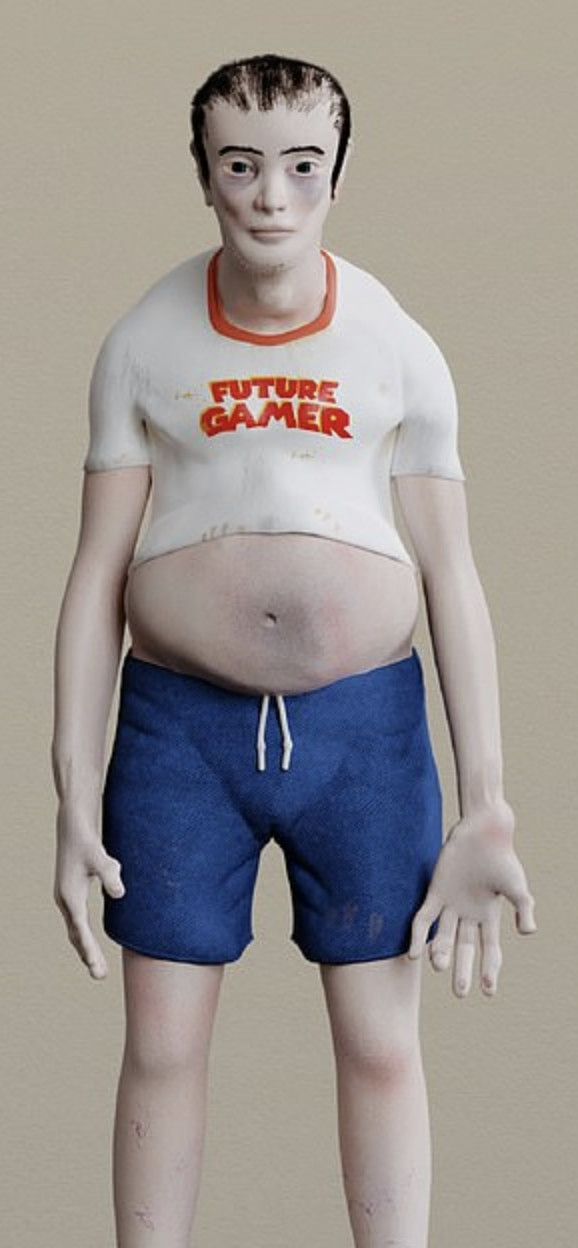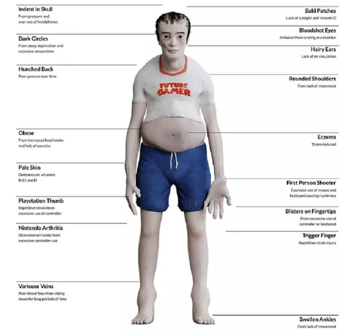 Cụ thể, sau khi tiến hành thu thập dữ liệu từ các tổ chức uy tín như NHS, National Geograph, WHO và UKIE, nhóm nghiên cứu đến từ O.C đã phác thảo hình ảnh một “game thủ nghiện game” sẽ trông như thế nào sau 20 năm nữa nếu vẫn cứ duy trì lối sống như thế này.
