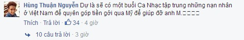 Diễn viên Hùng Thuận bình luận về vụ việc: "Sẽ có một buổi ca nhạc tập trung những nạn nhân ở Việt Nam để quyên góp tiền gửi qua Mỹ để giúp đỡ anh Minh".