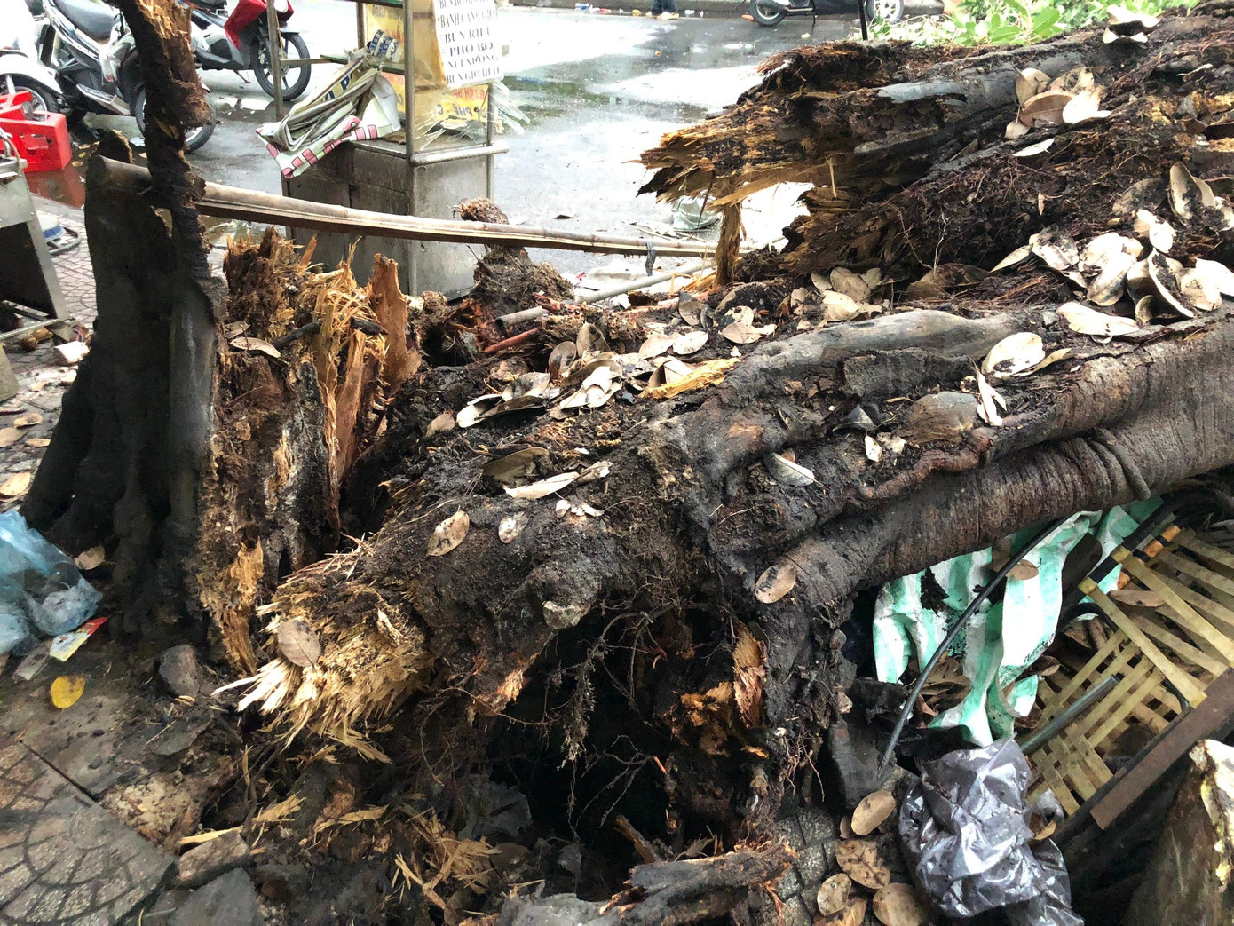 Lúc này một chủ quán bán hủ tiếu sát ngay gốc cây bị đổ vừa mới đẩy xe hủ tiếu đi bán về chưa kịp đẩy vào nhà thì bị gốc cây đổ đè trúng làm hư hỏng nhiều tài sản. Người phụ nữ may mắn tháo chạy nên thoát chết.