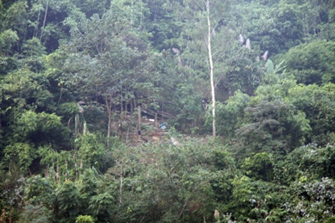 Theo chỉ dẫn của bà Oi, chúng tôi phải vượt qua một con suối, sau đó băng qua một quả đồi khá lớn mới tới được chân núi của ông Bùi Văn Bình, người được mệnh danh là "người rừng của bản Tra".
