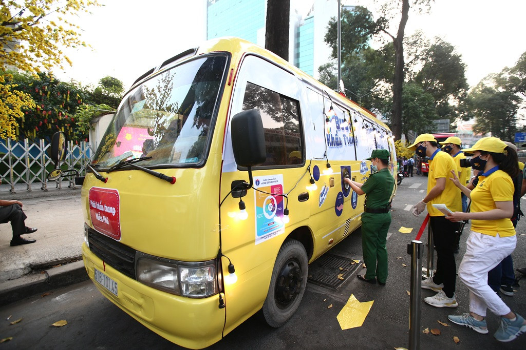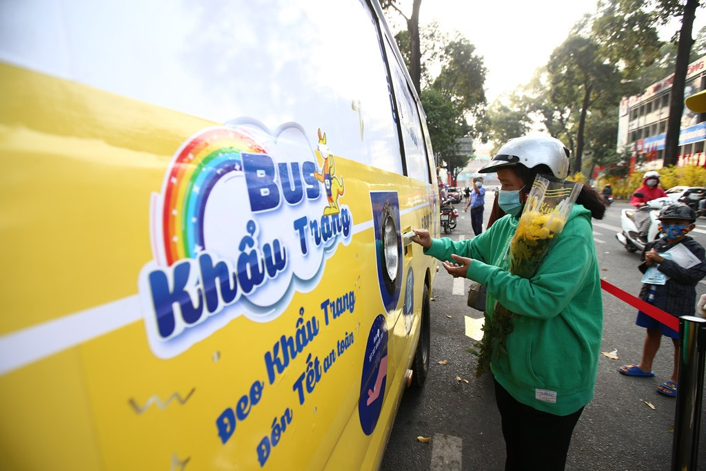 Ngày 6/2, nhiều người dân du xuân tại Nhà văn hóa Thanh niên (Q.1, TPHCM) bất ngờ với chiếc xe bus tự động phát khẩu trang miễn phí.