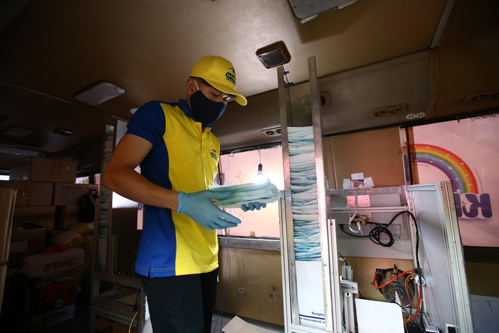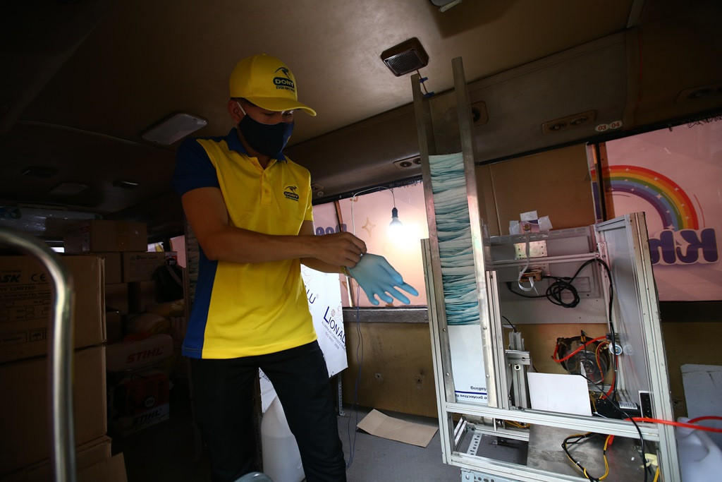 Xe bus phát khẩu trang có chiều dài 7m, chiều ngang 3,1m, trên xe đặt hai máy phát khẩu trang cảm ứng tự động. Khi đến lấy khẩu trang mọi người đều được hướng dẫn xếp hàng (giữ khoảng cách 2m), đến hệ thống máy thao tác và mỗi người nhận 2 khẩu trang vải kháng khuẩn.