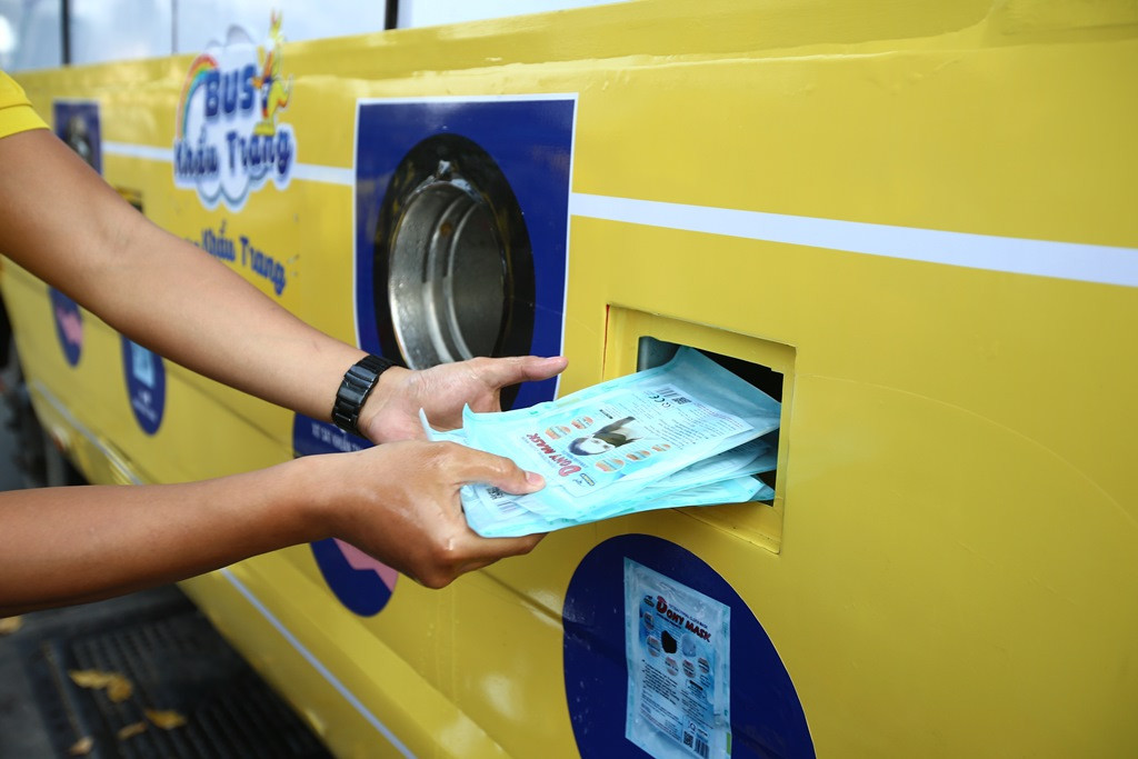 Bên trong xe bus được bố trí khay khẩu trang, nếu lượng hàng vơi sẽ có nhân viên châm đầy ngay lập tức. Đảm bảo không để người dân nào đến nhận khẩu trang mà không có.