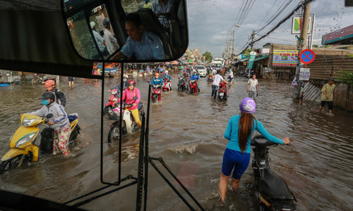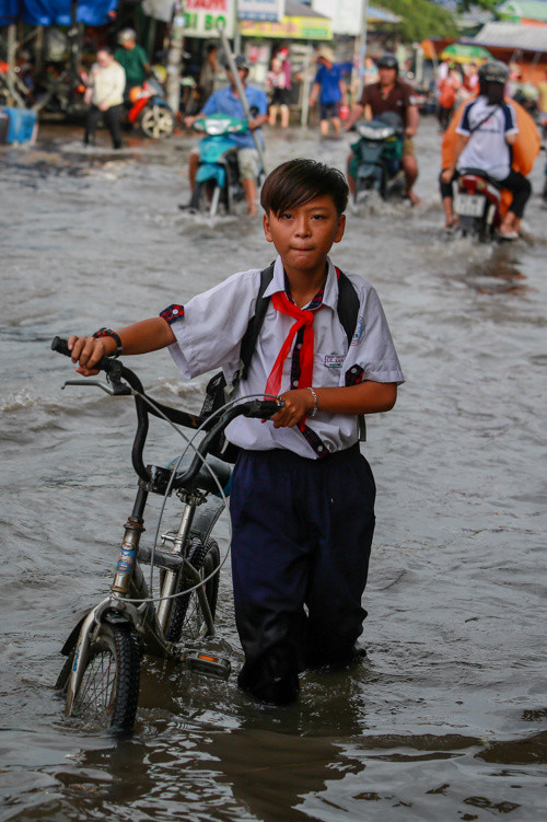 Đường ngập sâu, Bảo Phú, học sinh trường THCS Lê Tấn Bê (quận Bình Tân) phải dắt xe đạp. "Bữa nay em bị trễ học rồi", Phú cho biết.
