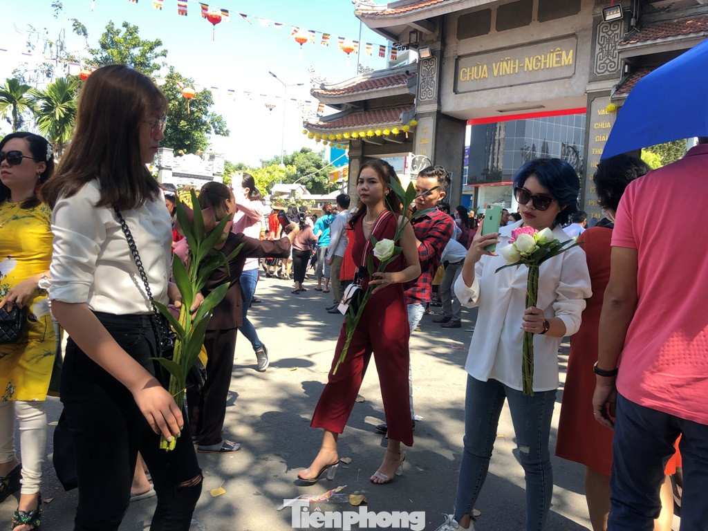 Nhiều cô gái trẻ chụp ảnh khoe facebook khi đi lễ chùa.