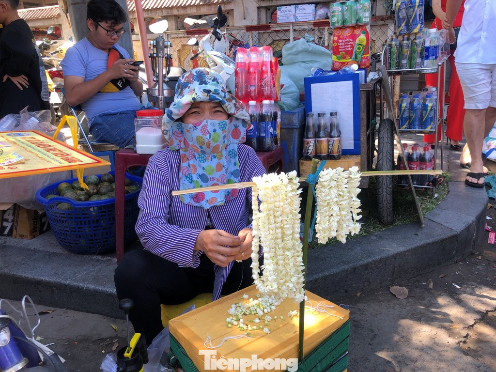 Dịch vụ bán hoa lài xâu thành chuỗi bên ngoài chùa, 10.000 đồng/dây.