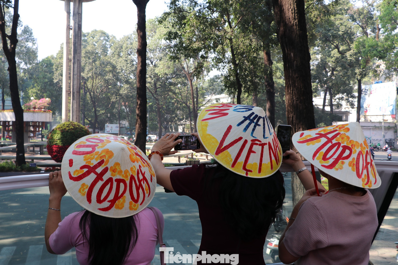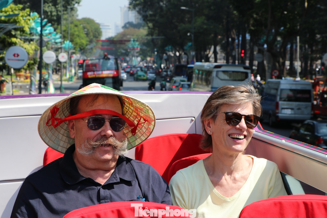 Nhiều du khách tỏ ra thích thú, chụp hình lưu niệm khi lần đầu tiên được đi xe buýt mui trần ở TPHCM.