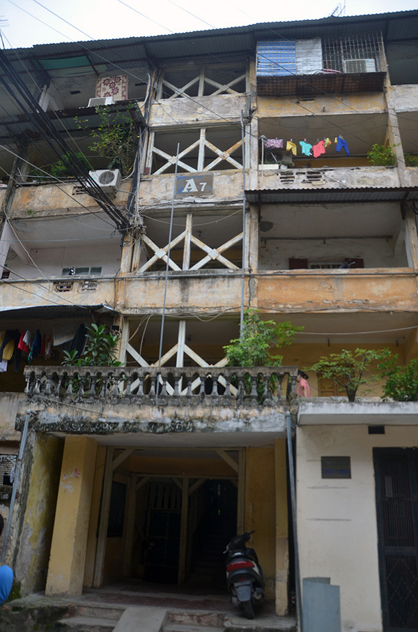 Chung cư A7 nằm trên phố Nguyễn Chính (phường Tân Mai, quận Hoàng Mai, TP Hà Nội) đang xuống cấp trầm trọng. Tại khu vực cầu thang bị nứt thành rãnh phải chống bằng hệ thống khung sắt chằng chịt, trong nhà thì cứ mưa đến là lại dột.