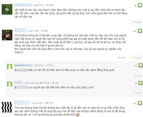 Không khó để tìm thấy comment chê nhà báo đem tiền trả lại là “Ngu”, rồi “Tại sao không giữ luôn mà đi trả lại làm gì. Nhặt được của rơi mà còn sĩ diện đem trả, hay không ăn được mới nhả?”, hay “Bị điên mới đi trả lại, dại thế!”.