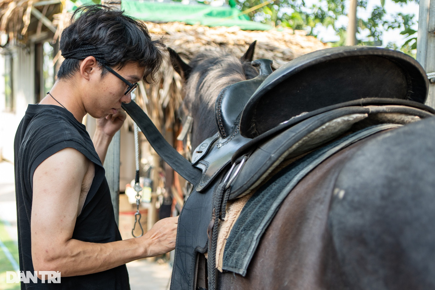 Hiểu tâm lý học viên sợ bị ngựa... đá, anh Phúc cùng các cộng sự liên tục huấn luyện 4 con ngựa nhập ngoại mỗi ngày, để chúng quen bài tập và nghe theo điều lệnh.