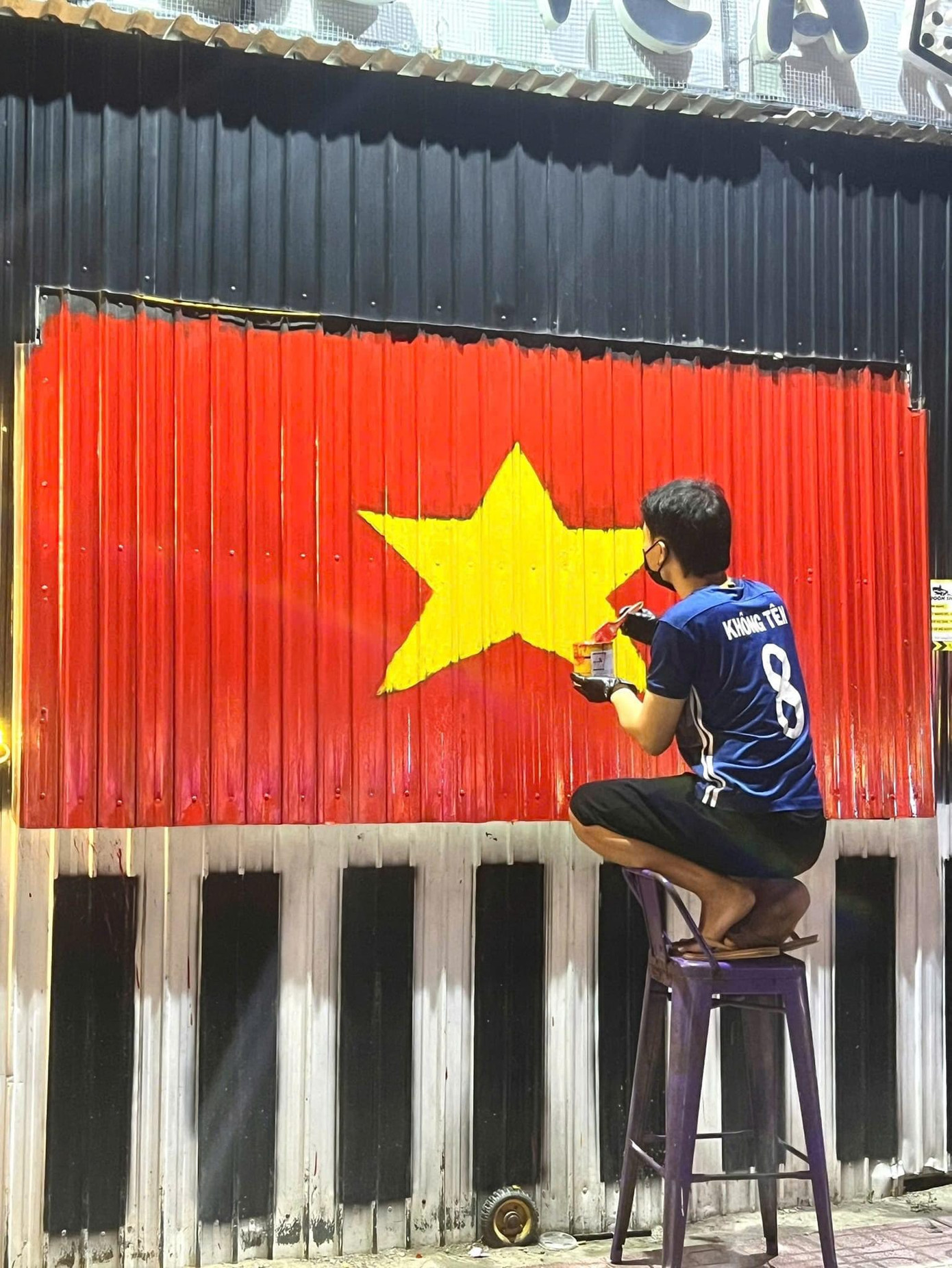 Thậm chí, vì điều kiện không thuận lợi cho việc vẽ lá cờ Tổ quốc lên mái nhà, nhiều người đã bắt "trend" bằng cách vẽ lên trên cánh cửa, trên nón...