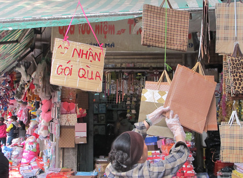 Một chủ cửa hàng bận rộn với dịch vụ gói quà cho khách hàng
