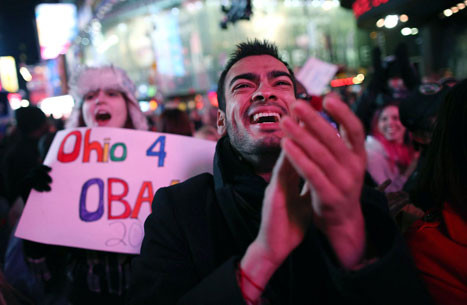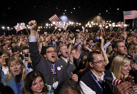 Ngay khi ứng cử viên Tổng thống Barack Obama có được hơn 270 phiếu đại cử tri - con số tối thiểu để giành chiến thắng, những người ủng hộ ông Obama đã reo hò ăn mừng.