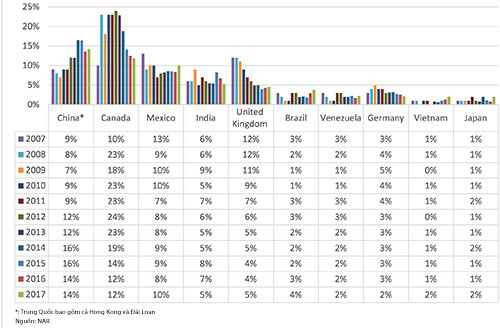 Công dân Trung Quốc, Canada, Mexico, Ấn Độ và Anh là những người nước ngoài chi nhiều tiền nhất cho bất động sản tại Mỹ. Trong đó, người Trung Quốc đứng đầu, với khoảng 31,7 tỷ USD, tăng 16,1% so với năm ngoái.