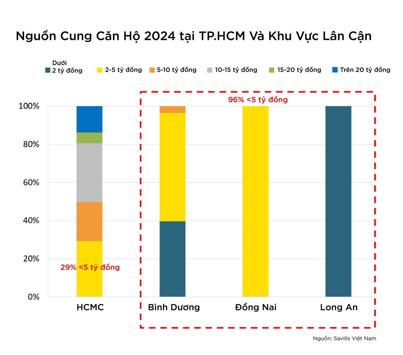 Cũng theo vị chuyên gia này, trong năm 2024, 96% nguồn cung nhà tương lai ở Bình Dương, Đồng Nai và Long An nằm ở phân khúc giá dưới 5 tỷ đồng/căn. Do đó, đây được xem là lời giải cho “cơn khát” nhà ở giá rẻ tại khu vực TPHCM.