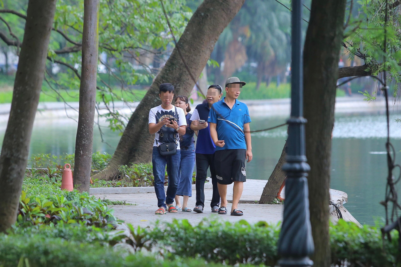 | Nhiều người dân không đeo khẩu trang, hoặc đeo khẩu trang sai cách ở hồ Hoàn Kiếm. Ảnh: Duy Phạm |