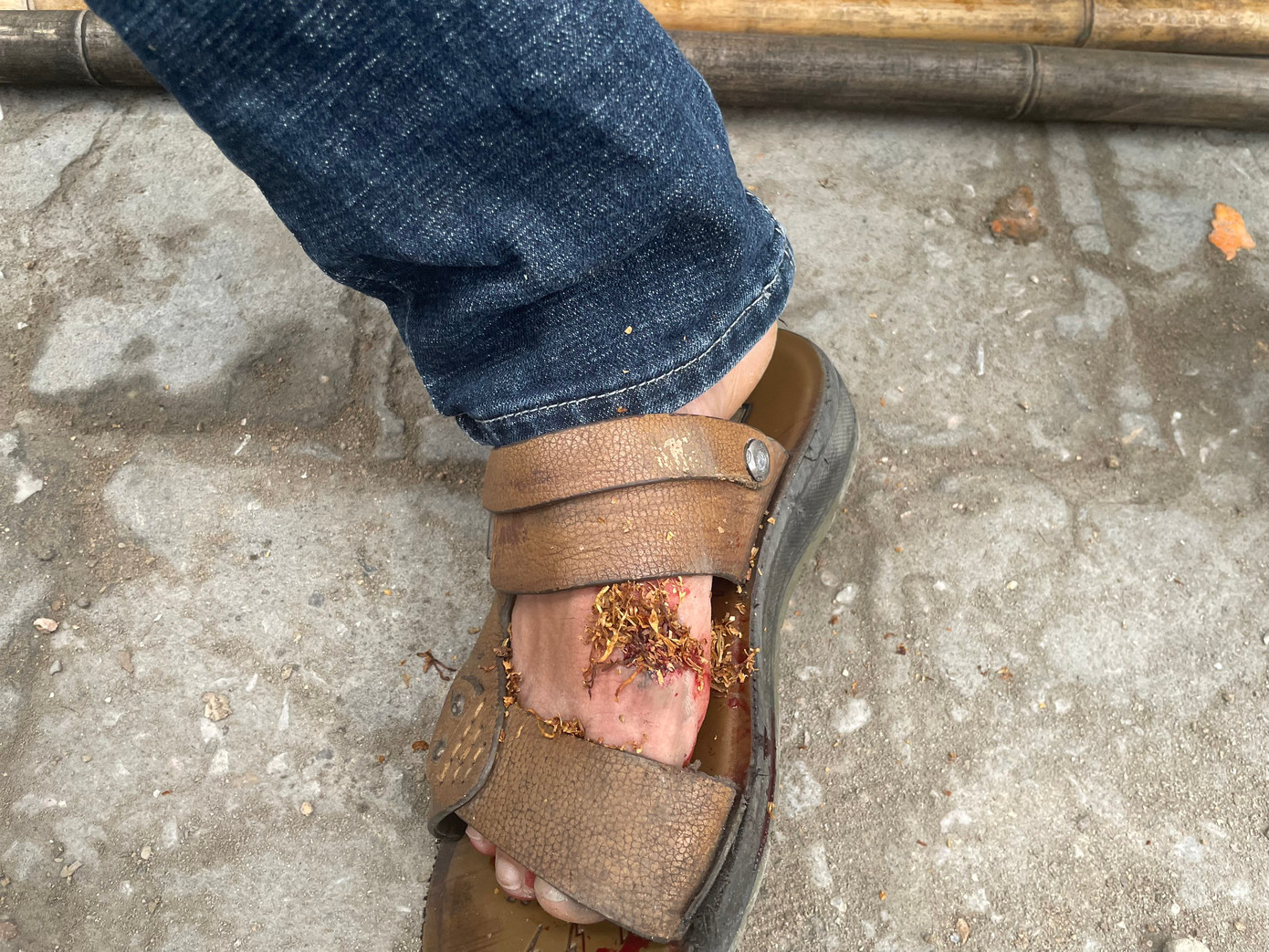 | Anh Nguyễn Duy Điệp, (34 tuổi, quận Hoàng Mai, Hà Nội) bị ngã tại đoạn đường này, chia sẻ: "Mép đường trơn trượt, chỉ cần không để ý là ngã ngay. Đoạn đường này có nhiều xe đi lại, may mắn là lúc tôi ngã không có xe ô tô nào đi đằng sau". |