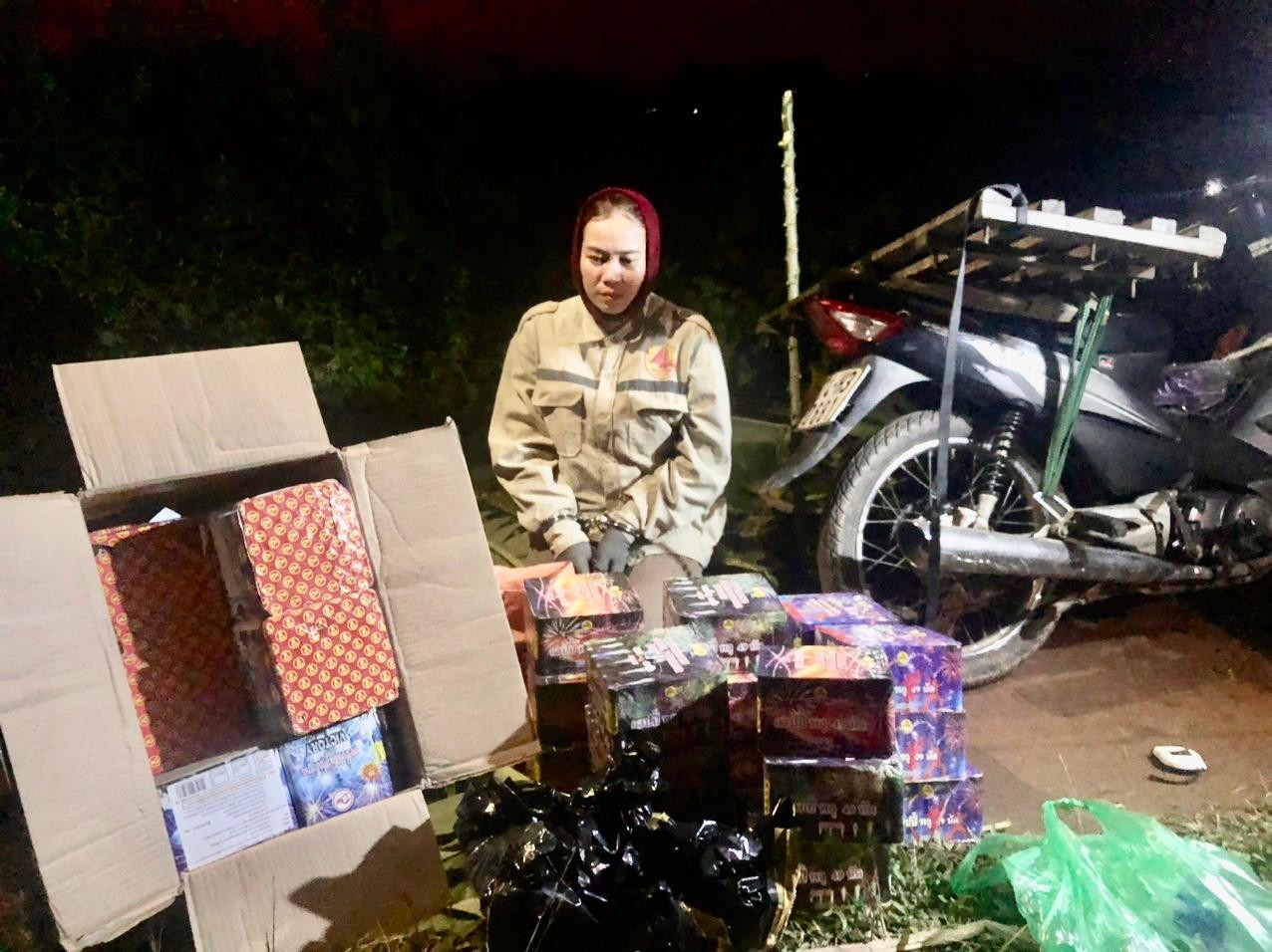 Qua kiểm tra, phát hiện 2 túi đen được ngụy trang bên ngoài bằng lớp lá chuối. Bên trong 2 túi đen có 38 hộp giấy, bà Lân khai nhận là pháo lậu.
