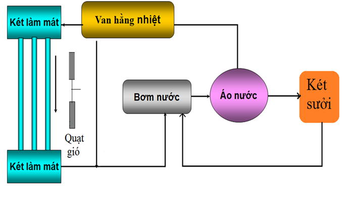 Theo như sơ đồ cho ta thấy nước được hút từ đáy két là nước đã được làm mát, nhờ bơm hút và bơm vào áo nước ( vỏ ngoài của xy lanh ) ở đây nước sẽ làm mát cho xy lanh, khi đi qua đây nước sẽ nóng lên và được đẩy ra két nước làm mát, nước chảy qua két làm mát được quạt gió thổi gió qua sẽ được làm nguội, sau đó lại trở về làm mát cho động cơ theo một vòng tuần hoàn.