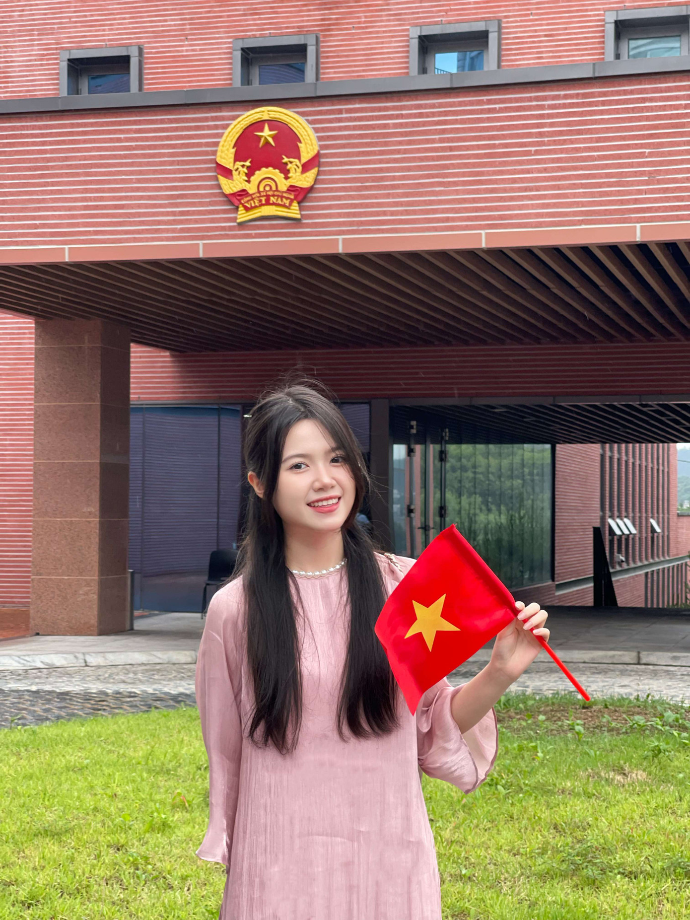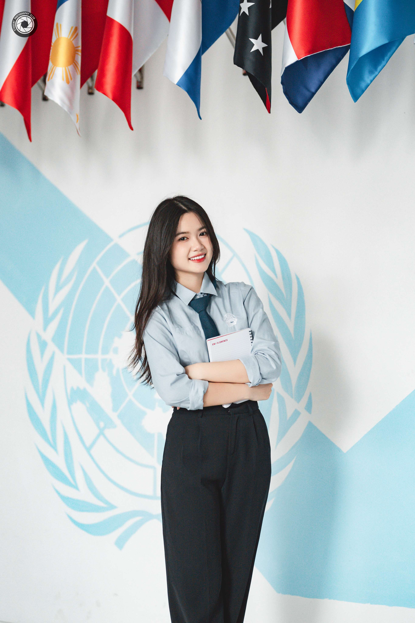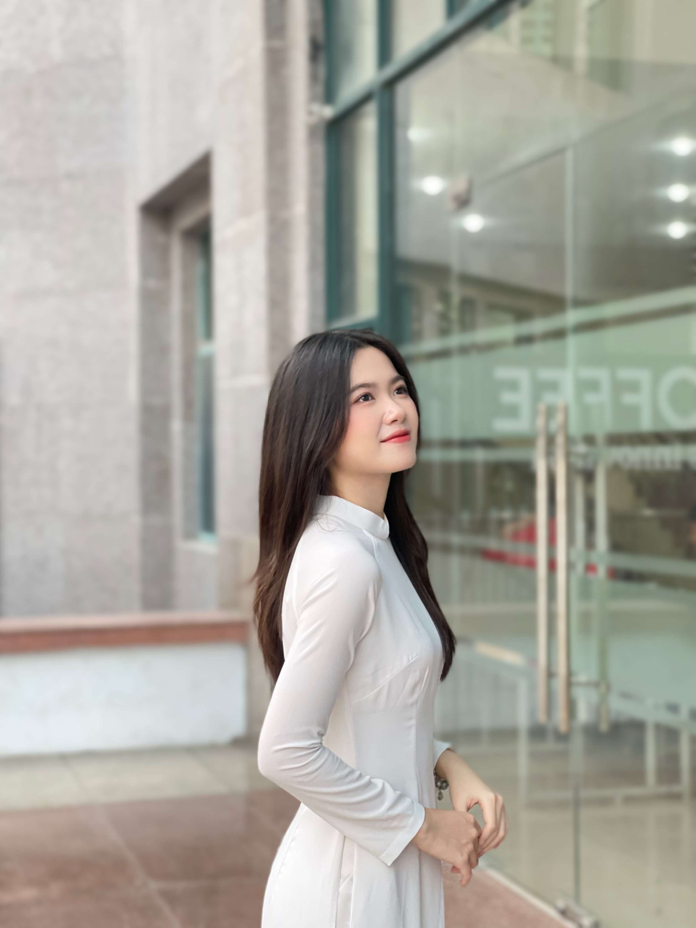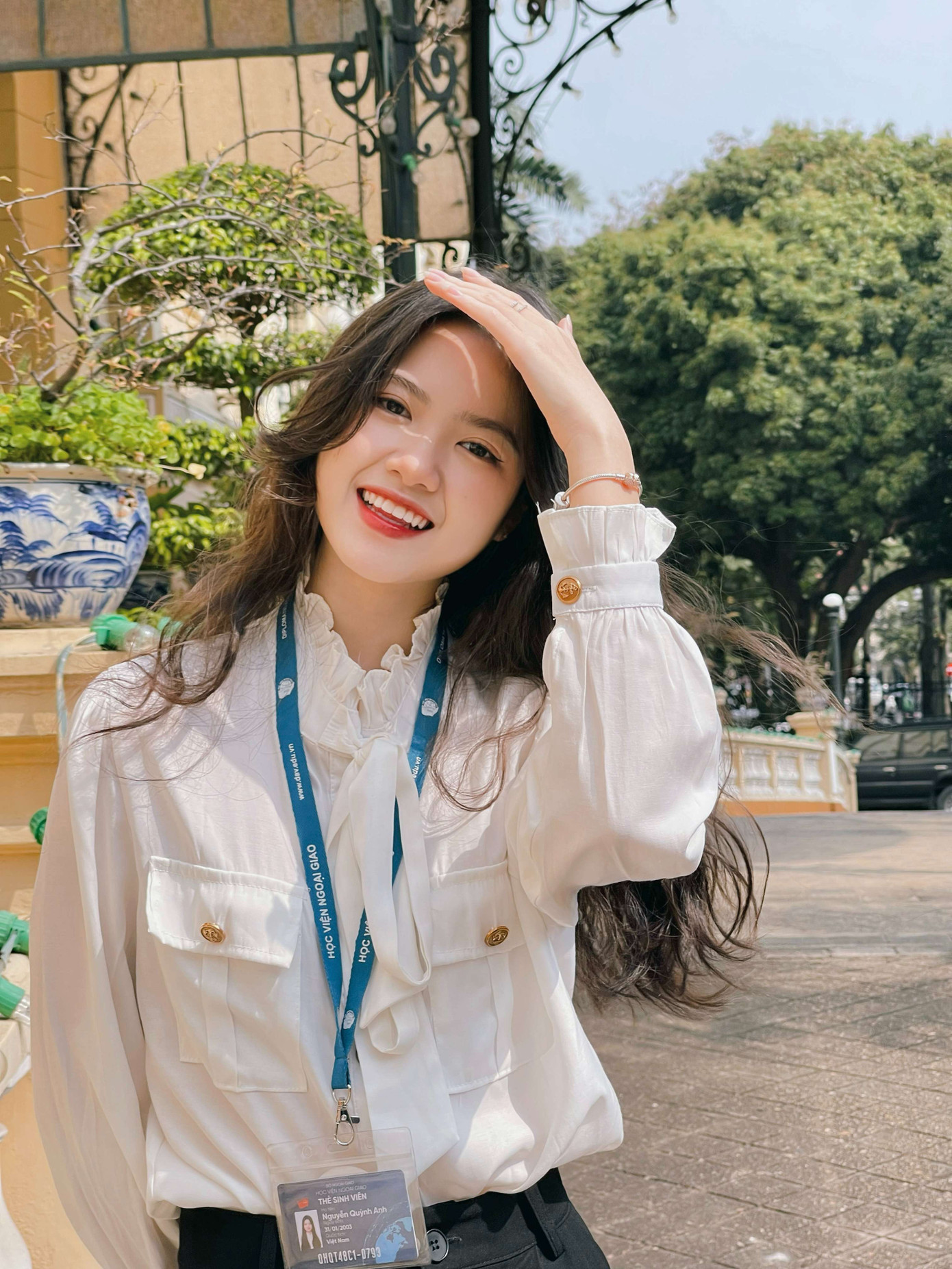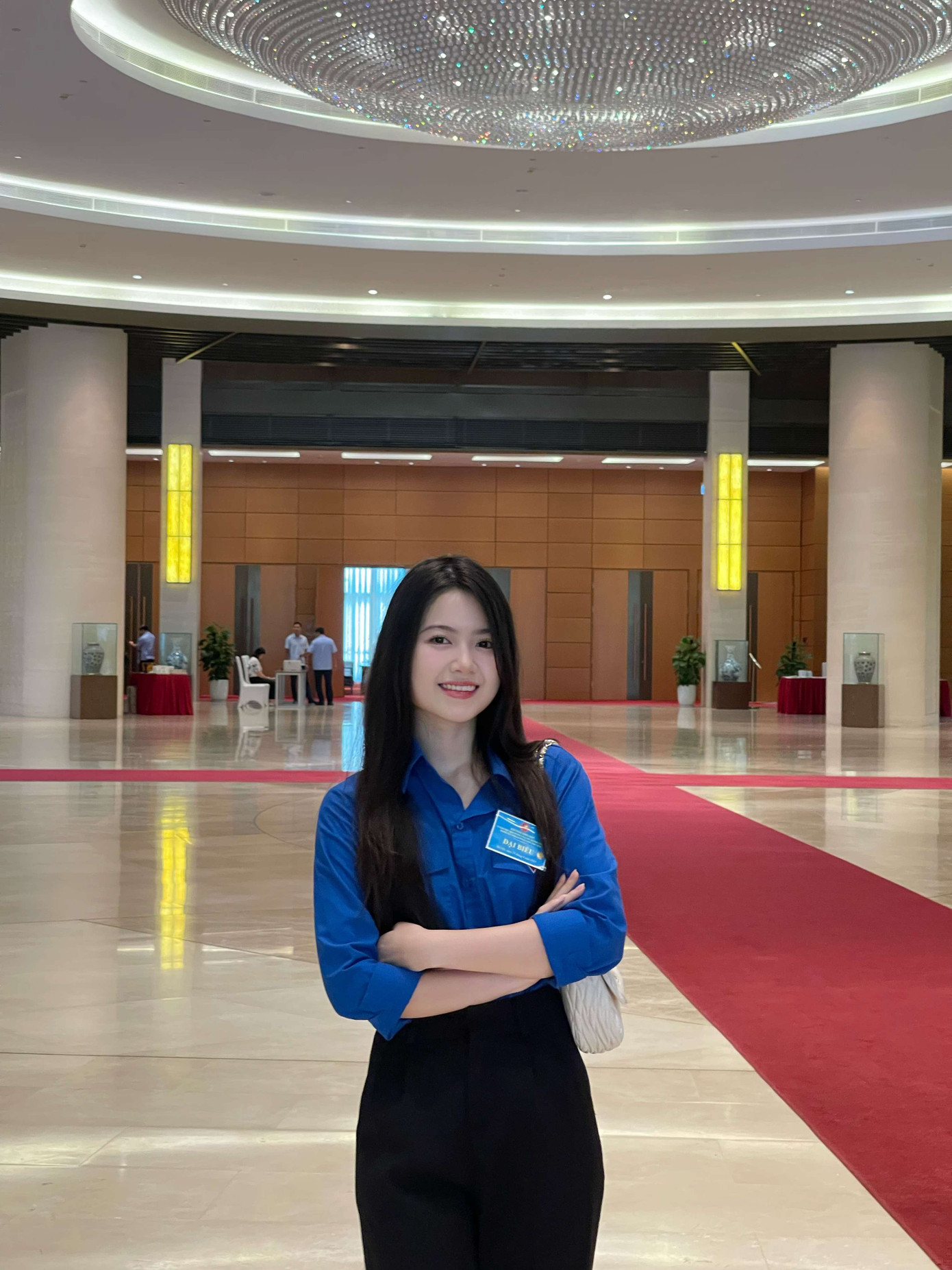 | Quỳnh Anh trong màu áo xanh thân thương của Đoàn Thanh niên Học viện Ngoại giao. |