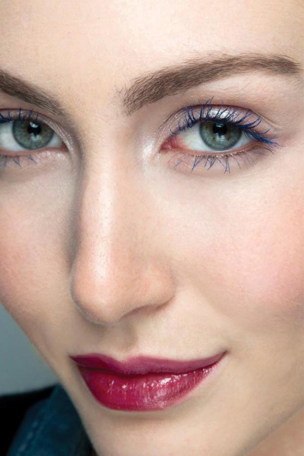 Nếu sử dụng mascara xanh biển vào buổi tối, bạn có thể phủ một lớp nhũ ánh trang kim mỏng lên bầu mắt để tăng độ bắt sáng, nên kết hợp mascara xanh biển với son bóng màu đỏ đậm và má màu hồng táo. Đây sẽ là kiểu trang điểm nổi bật trong mùa hè.