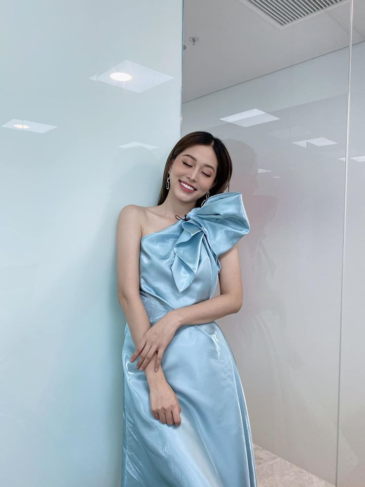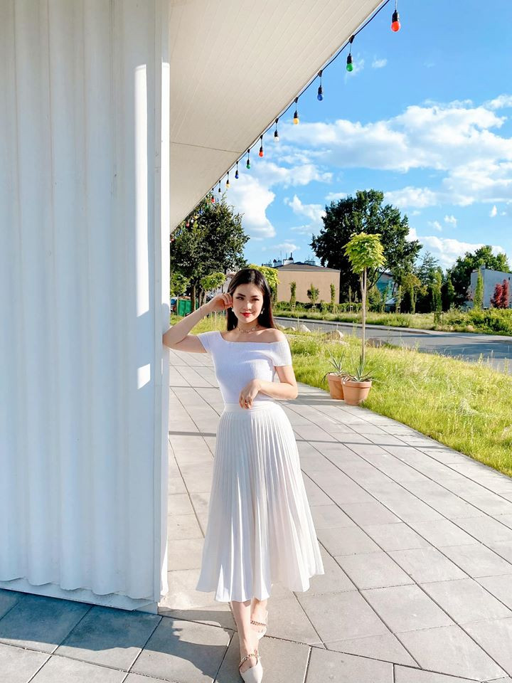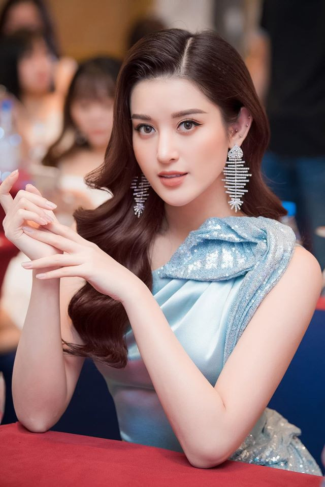 Á hậu Phương Nga khoe vai trần quyến rũ trong bộ váy lụa lệch vai màu xanh pastel.