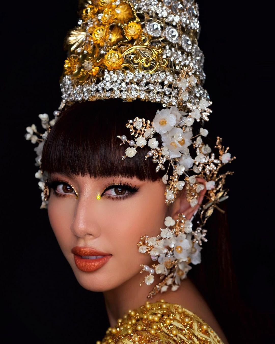 Khoác lên mình bộ trang phục dát vàng lộng lẫy cùng với phụ kiện đội đầu cực kỳ tinh xảo và cầu kỳ, Thuỳ Tiên hoá thân thành một cô gái Thái vô cùng kiêu sa, xinh đẹp.