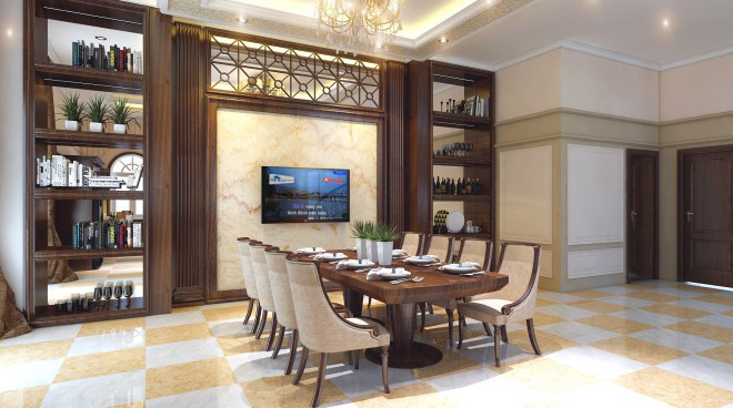 Khu vực trung tâm bếp và nhà ăn được bố trí bàn ăn 8 ghế, kệ trang trí đá và kính mang tới vẻ sang trọng.