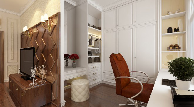Phòng thay đồ kết hợp hài hòa với góc làm việc tiện dụng và nhiều ánh sáng.