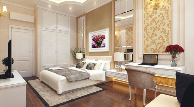 Phòng ngủ lớn ở tầng 2 tông màu vàng kem nhã nhặn dựa theo phong cách cổ điển.