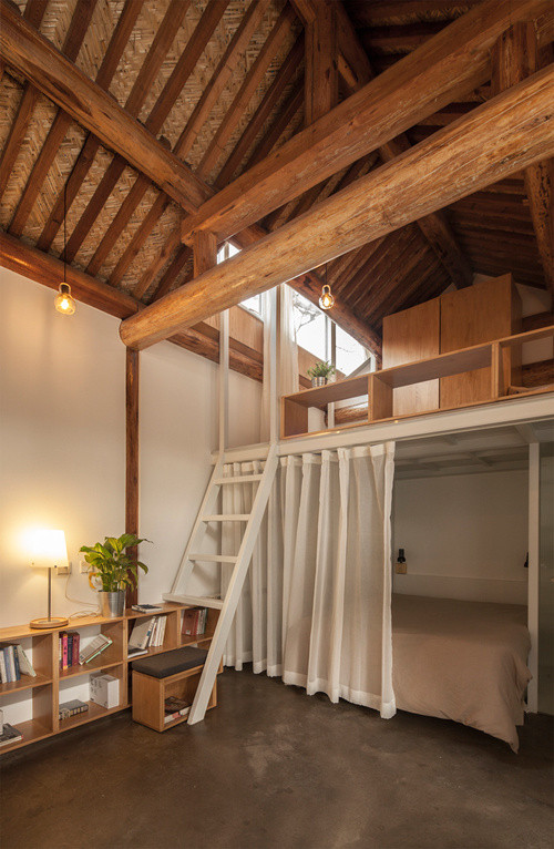 Đây có thể là chỗ ngồi đọc sách, phòng ngủ dự phòng. Ô cửa kính áp trần nhà được lắp đặt để lấy sáng cho gác xép.
