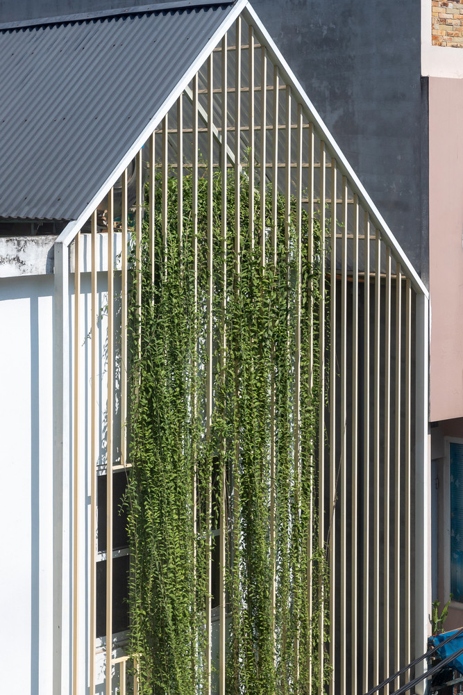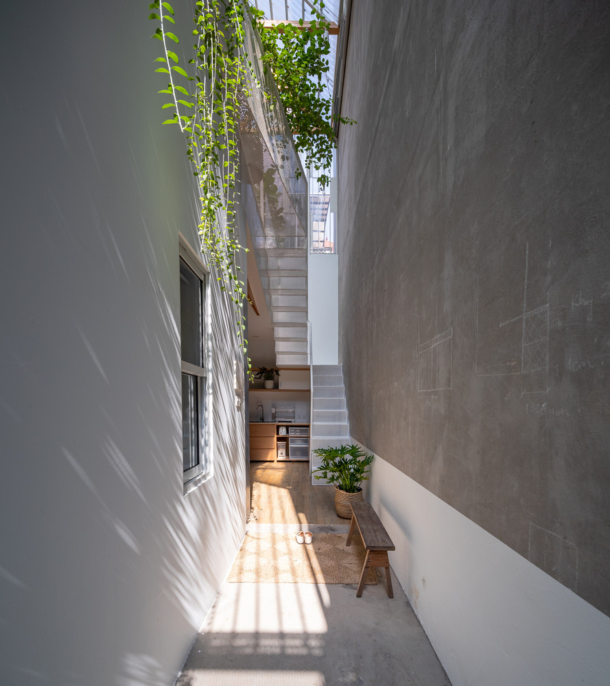 Khác với đa số nhà ống xung quanh, để tiếp cận không gian bên trong, một hành lang thông tầng được thiết kế bên hông như một giải pháp lấy sáng xuống tầng trệt và khoảng xanh trong nhà.