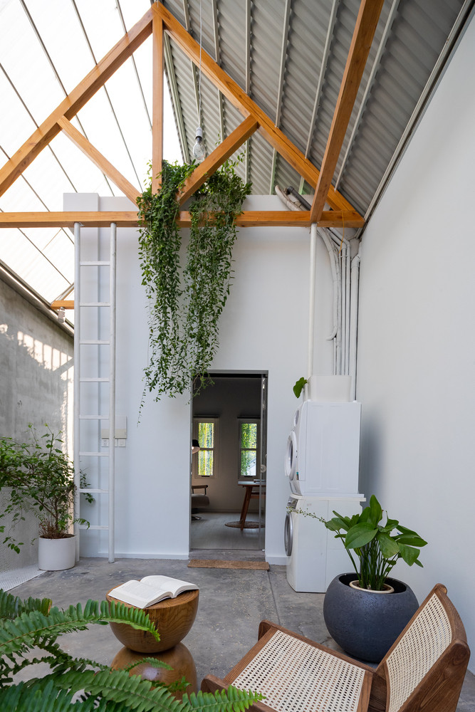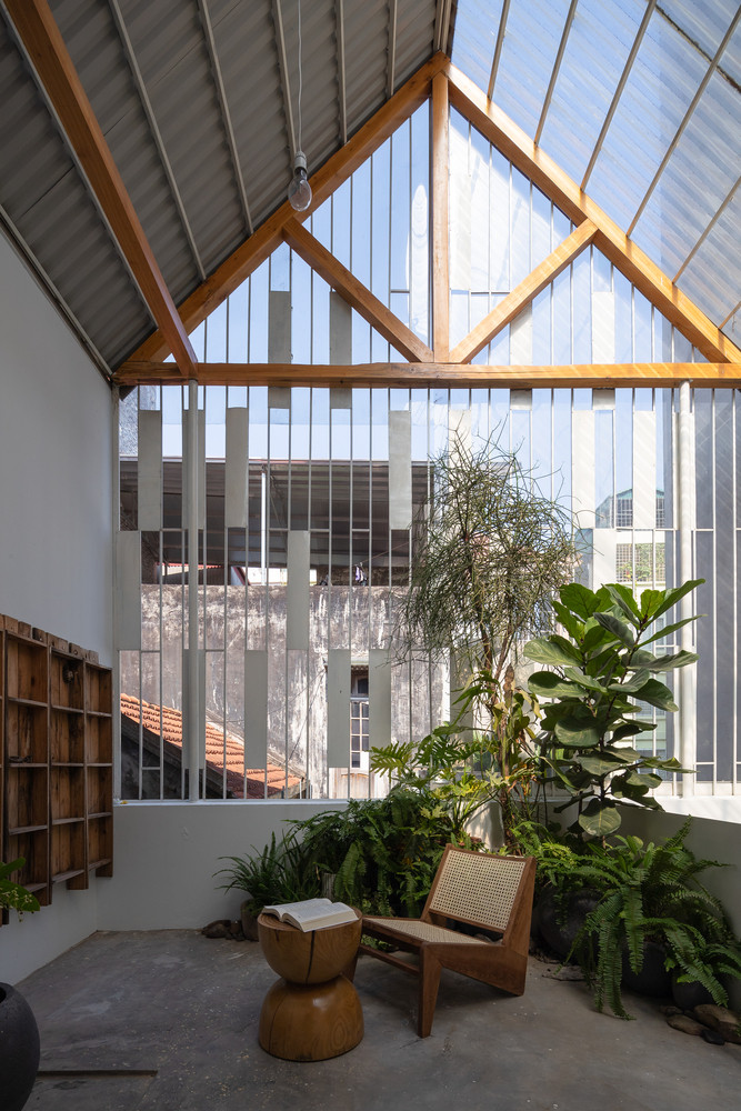 Phần vườn áp mái liền kề với phòng làm việc, một nửa mái chéo được làm từ tấm lợp trong suốt để lấy ánh sáng cho các khoảng xanh và tạo cảm giác không gian được mở rộng.
