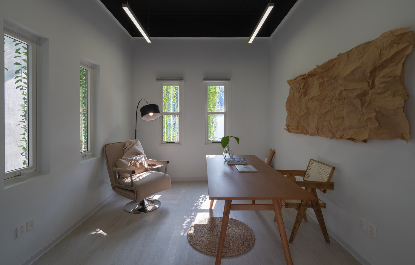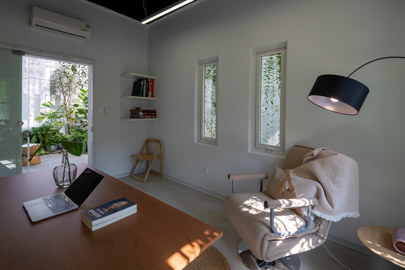Phòng làm việc được thiết kế đơn giản, tập trung lấy sáng tự nhiên và cửa kính chống ồn, khi cần thiết có thể mở bung các cửa sổ cho thoáng khí.