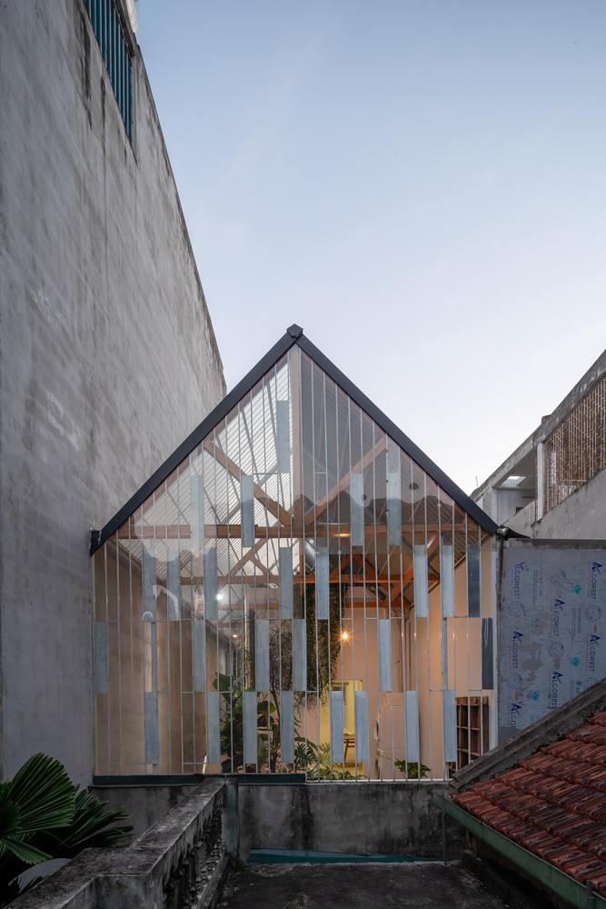 Mái nhà và các mặt bao che trước sau được ví như một chiếc áo mưa, trùm lên khối nhà cũ, bảo vệ phần tường, sàn khỏi xuống cấp do thời tiết. Do phần hiện trạng đã được xây dựng khá lâu và xuống cấp, "áo" bao che được thiết kế với trọng lượng nhẹ nhất, bao gồm sắt, tấm lợp và gỗ - các vật liệu phổ biến ở địa phương.