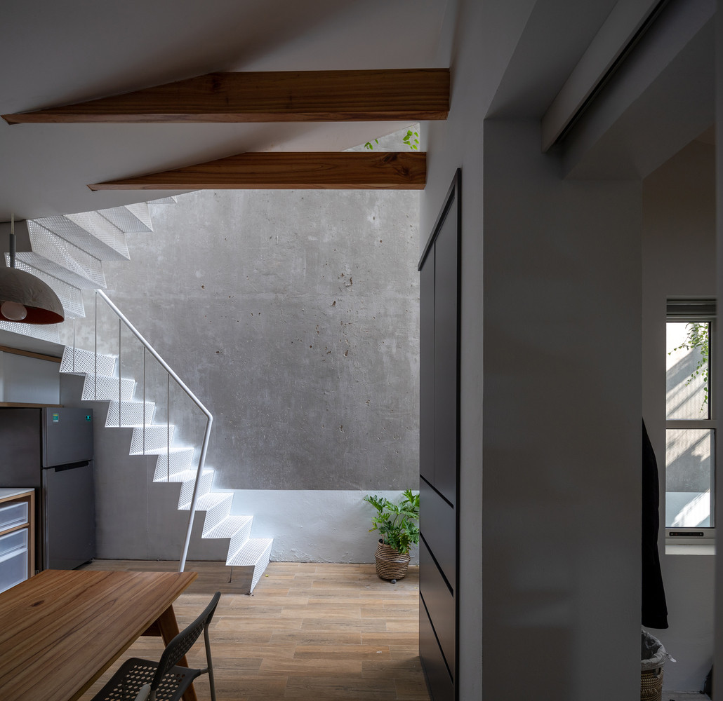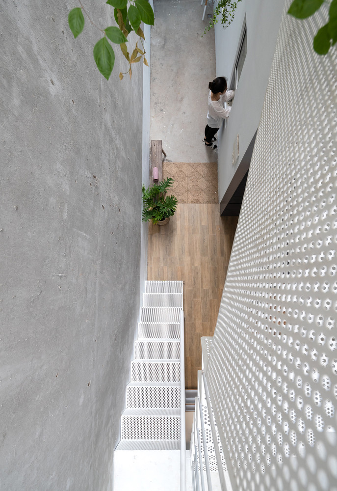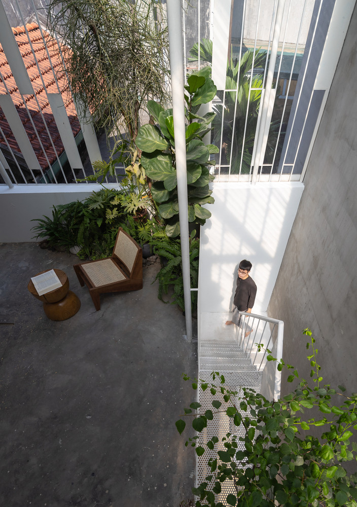 Cầu thang sắt lỗ được tạo ra để kết nối tầng trệt và lầu 1, đảm bảo ánh sáng lọt xuống khu bếp vào ban ngày.