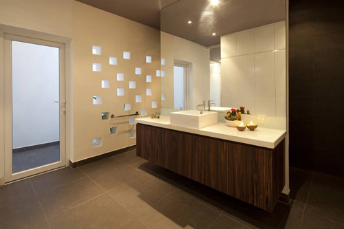 Thách thức của dự án này là xây dựng một ngôi nhà hiện đại, gợi cảm giác sang trọng, cao cấp với một ngân sách rất hạn chế. Vì lý do này, các yếu tố kiến trúc đều thực sự đơn giản, cụ thể là kết cấu bê-tông, gạch, gạch men, mái tôn lợp mái nhà làm bằng chất liệu cách nhiệt. Trong khi đó, đồ nội thất cũng như thiết bị gia dụng có chất lượng cao.