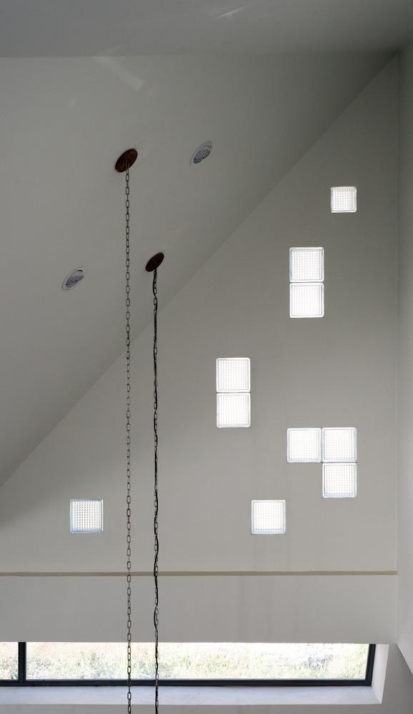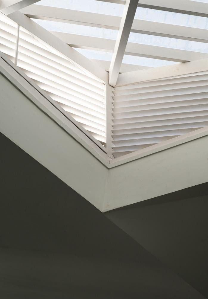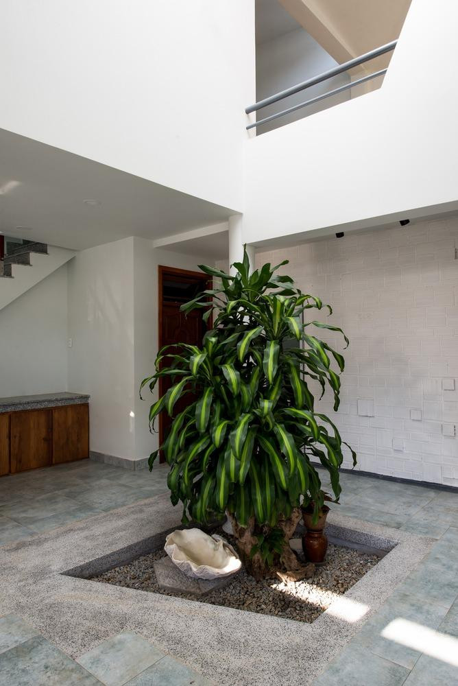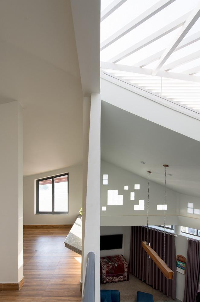 | Không gian trong nhà được liên thông bằng khoảng thông tầng, giữa nhà là giếng trời kết hợp với màu sơn ngoại thất trắng giúp ngôi nhà luôn tràn ngập ánh sáng. Đây chính là nguồn sáng chủ yếu của ngôi nhà vào ban ngày để tiết kiệm năng lượng. |