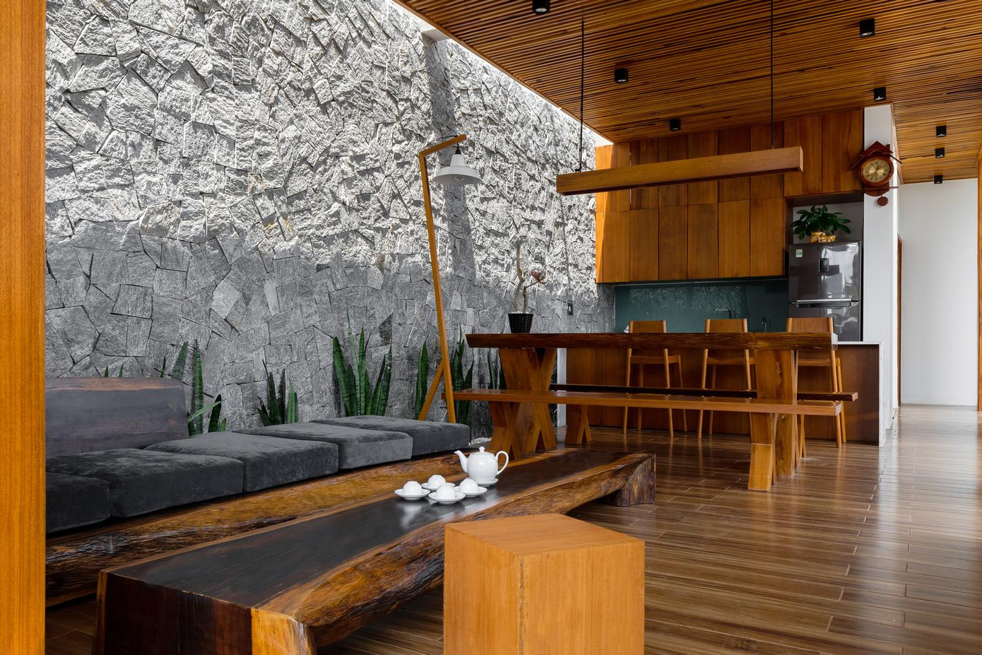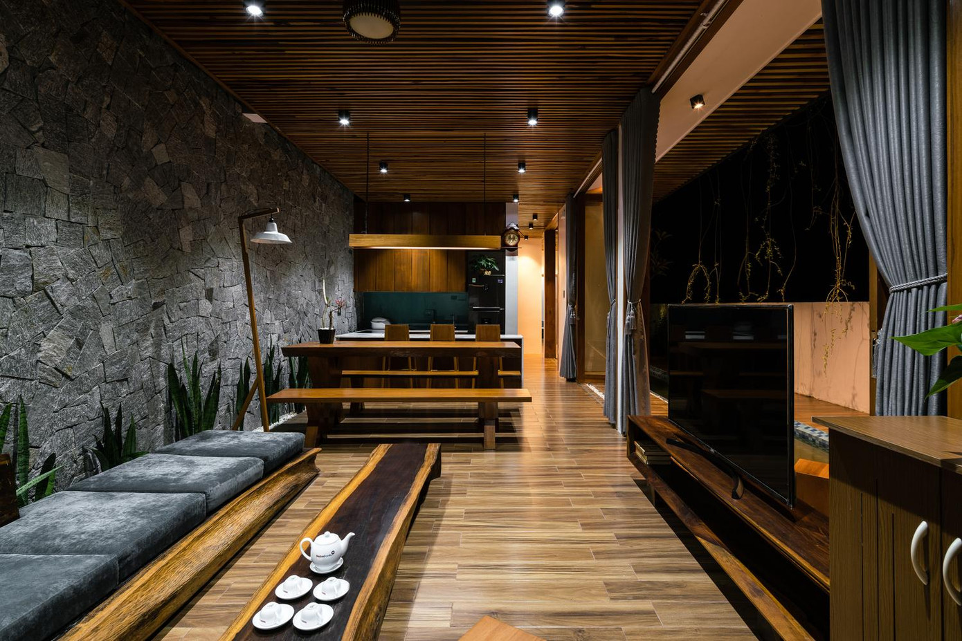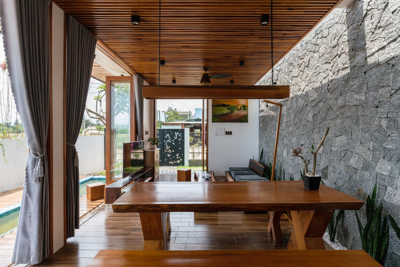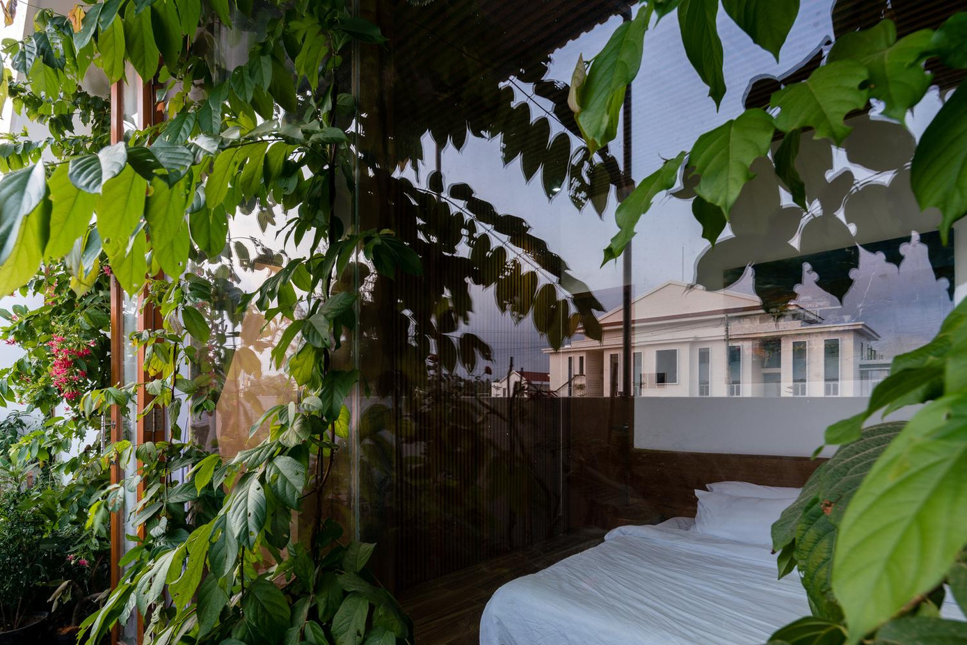 | | Các kiến trúc sư đã xem xét kỹ lưỡng từng chi tiết về khí hậu, quỹ đạo mặt trời để đưa ra giải pháp thu ánh sáng tự nhiên, che nắng ở phía Tây mặt tiền chính của công trình cũng như lấy gió mát của sông từ phía sau. |  | | Không gian chính bao gồm khu vực tiếp khách và ăn uống còn không gian yên tĩnh nằm ở hình khối phía sau gồm ba phòng ngủ và hai nhà vệ sinh. |  | | Đặc biệt, một hệ thống mương nước nhỏ chạy bên hông nhà đóng vai trò giảm nhiệt cho cả công trình giữa khí hậu khắc nghiệt của miền Trung Việt Nam. |  | | Cửa trượt gỗ được sử dụng để cho phòng khách rộng rãi và thông thoáng hơn, hơn nữa nó còn giúp tạo ra một tầm nhìn tuyệt vời để ngắm cảnh. |  | | Về khía cạnh nội thất, tất cả sofa, bàn ăn hay giường ngủ đều được làm từ gỗ tự nhiên của địa phương. |  | | Ngôi nhà được bao phủ bởi tấm polycarbonate và dây leo từ mái nhà. Bằng cách đó, chúng ta có thể ngăn chặn bức xạ mặt trời trên các bức tường kính. | |