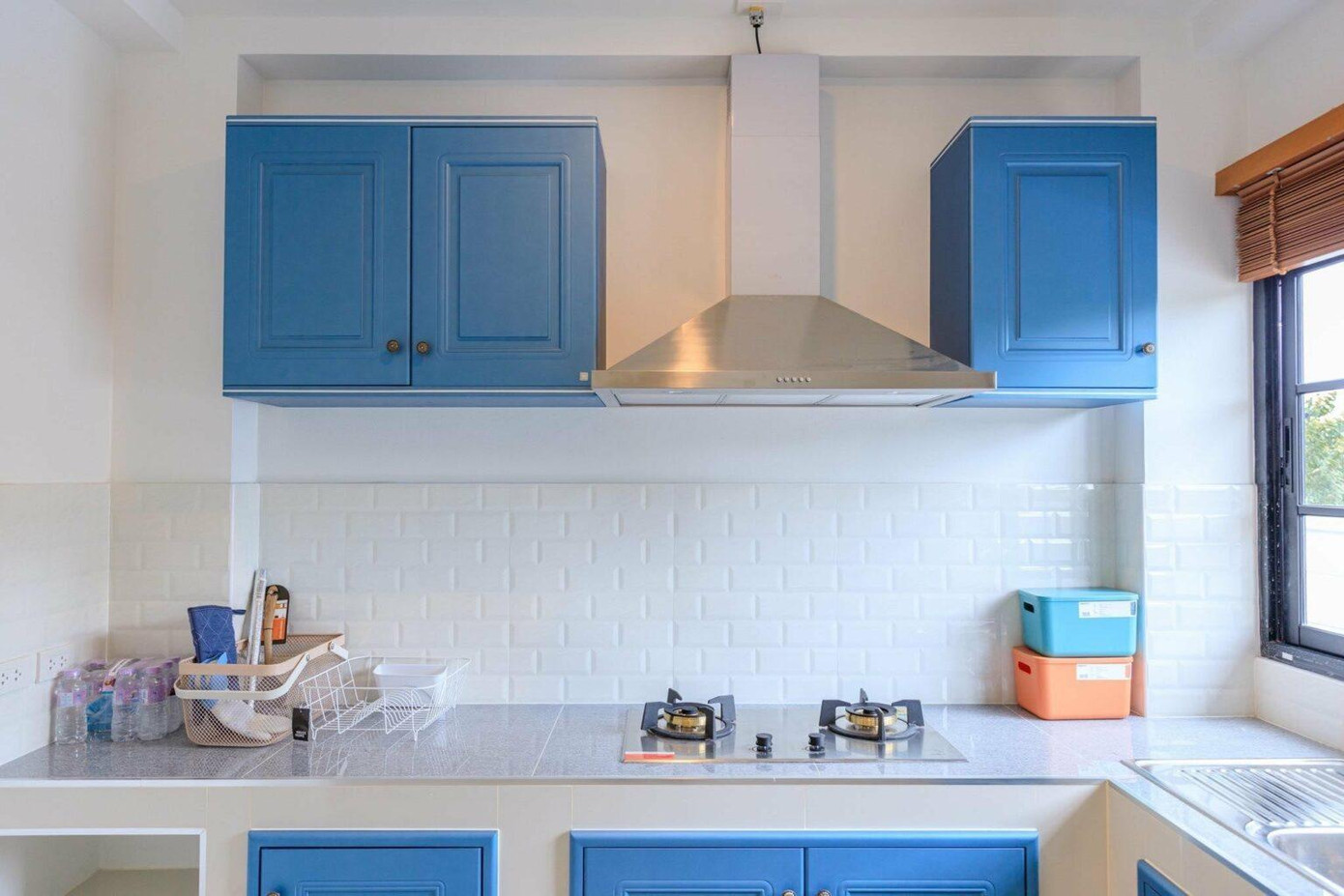 | Căn bếp gọn gàng với điểm nhấn là các tủ đựng đồ màu xanh dương. |