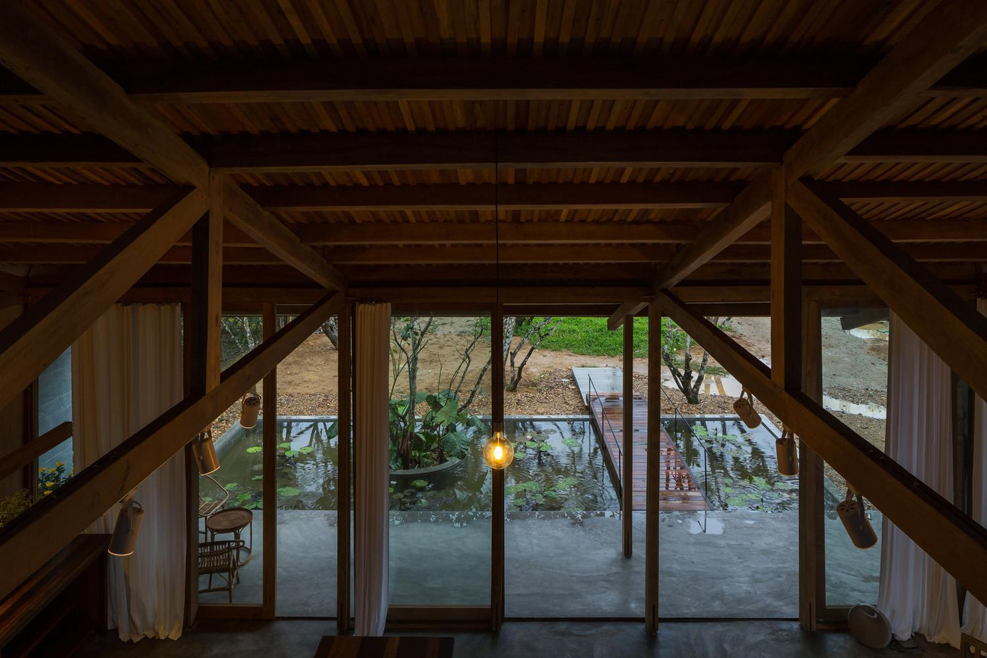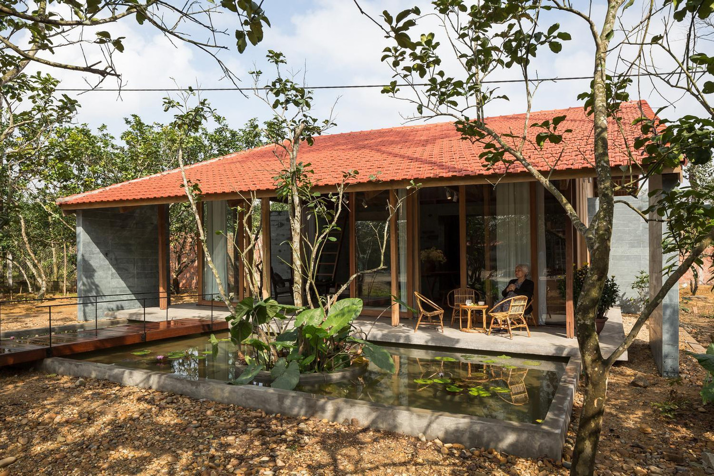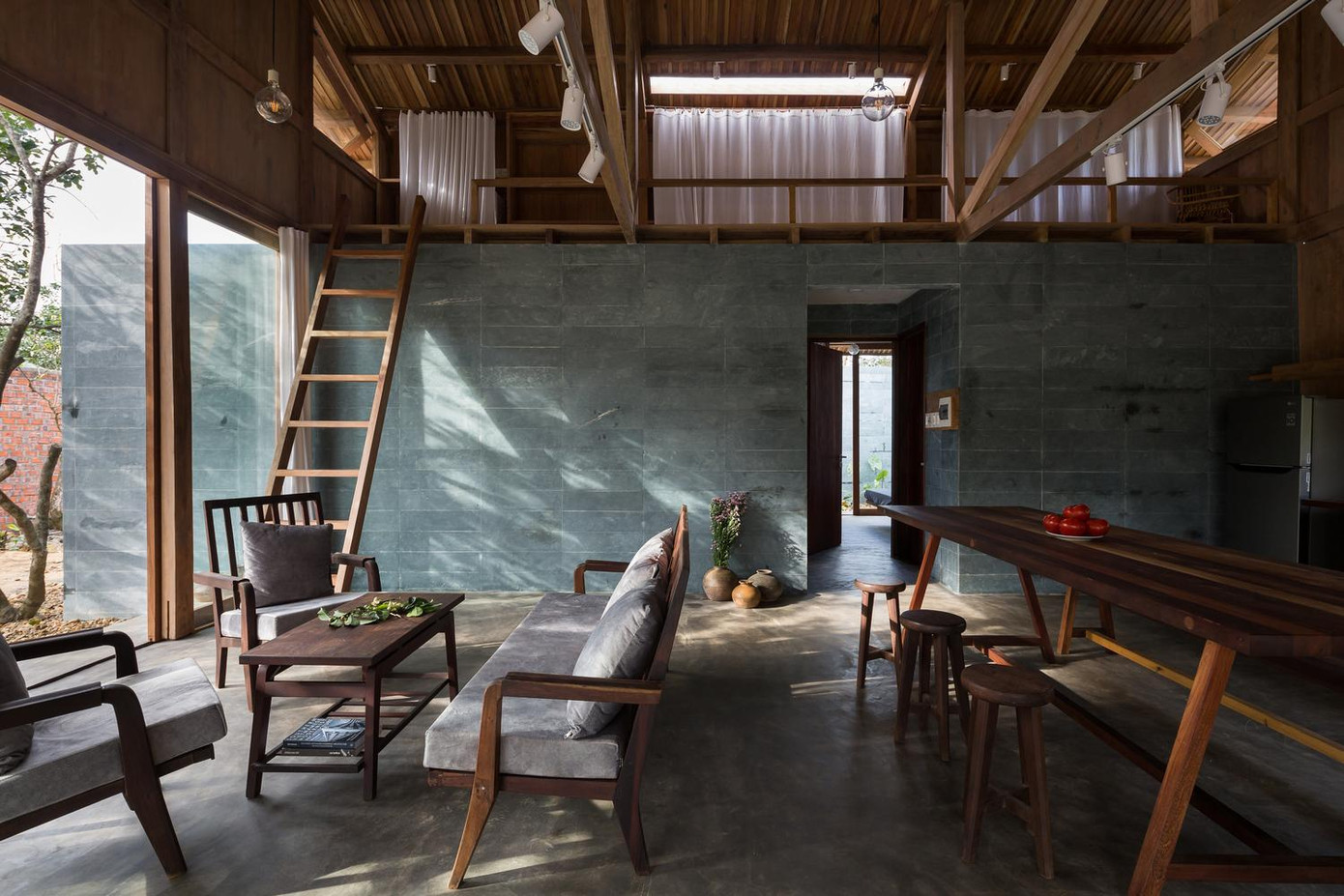 | Khu vực chung bao gồm khu sinh hoạt, ăn uống và bếp nhỏ kết nối với hàng hiên đi dọc theo mặt tiền chính, hướng ra ao hoa súng trước nhà. Có một cây cầu gỗ nhỏ bắc qua ao là lối vào chính của ngôi nhà.  | | Hai phòng ngủ và phòng vệ sinh mang đến sự riêng tư và bầu không khí êm dịu bởi bức tường đá tự nhiên bao bọc xung quanh, tạo ra những khu vườn bên trong cho mỗi không gian. |  | | Gác lửng bằng gỗ được chiếu sáng bởi giếng trời trên mái, đây được coi là thư viện và kho lưu trữ của gia đình. |  | | Tất cả các không gian của ngôi nhà đều được bao phủ bởi một mái dốc lớn đảm bảo che nắng và giúp thích nghi với khí hậu nhiệt đới của khu vực luôn có nhiều ánh nắng gay gắt vào mùa hè và mưa lớn kéo dài như Huế. |  | | Hầu hết đồ nội thất, khung chính và tường của ngôi nhà được làm bằng gỗ nghiến được thu thập từ cấu trúc của các tòa nhà cũ bị phá bỏ. |  | | Các loại đá, gỗ, bê tông, thủy tinh, đất nung, dệt, nước, cây xanh… tạo nên một bảng màu đẹp và đặc sắc cho ngôi nhà. | |