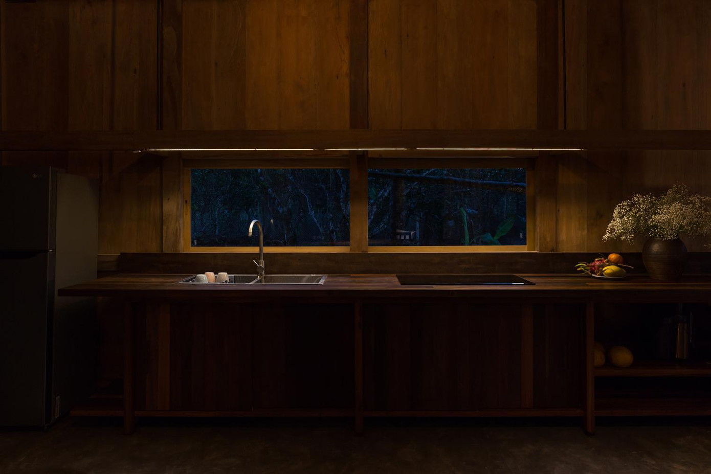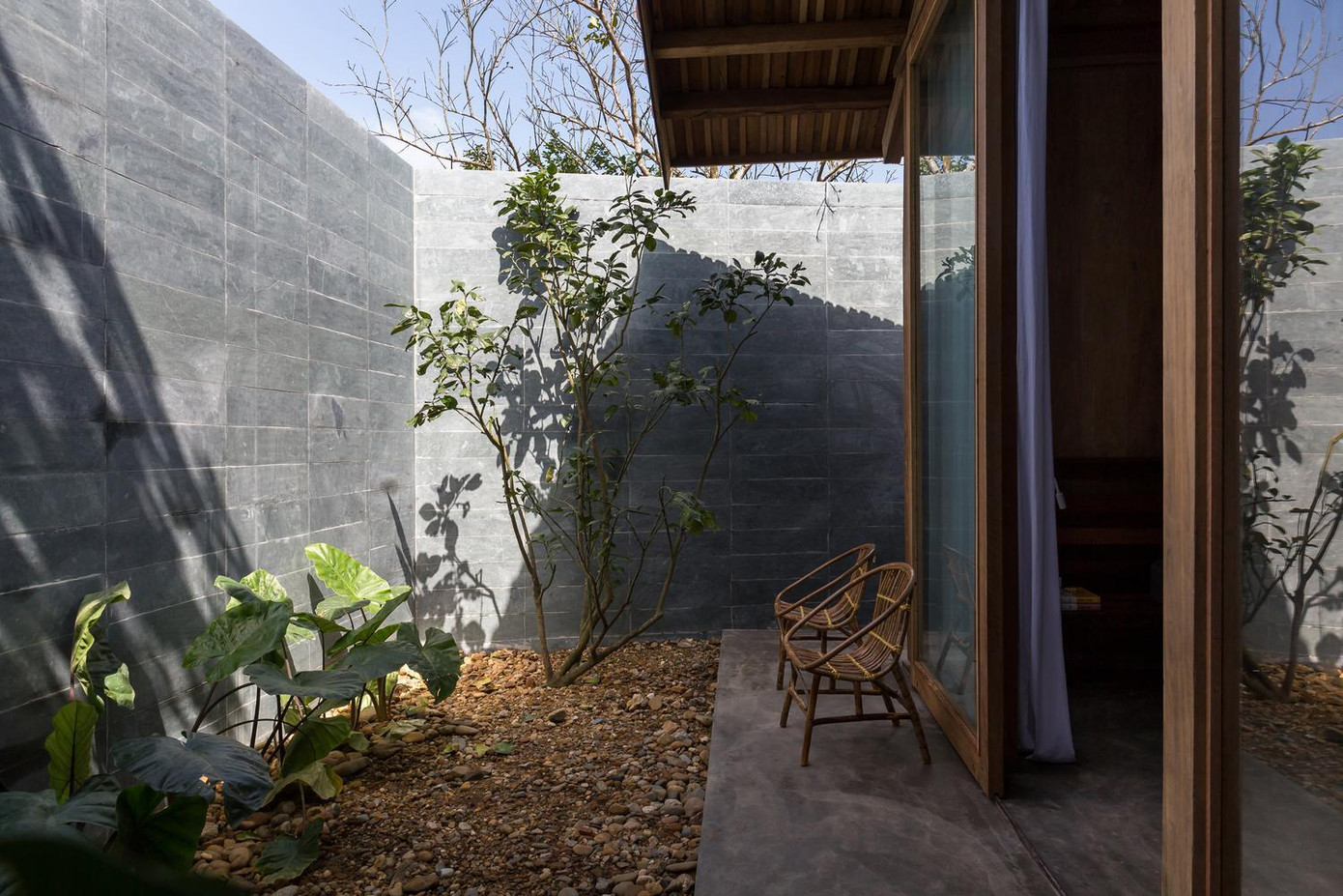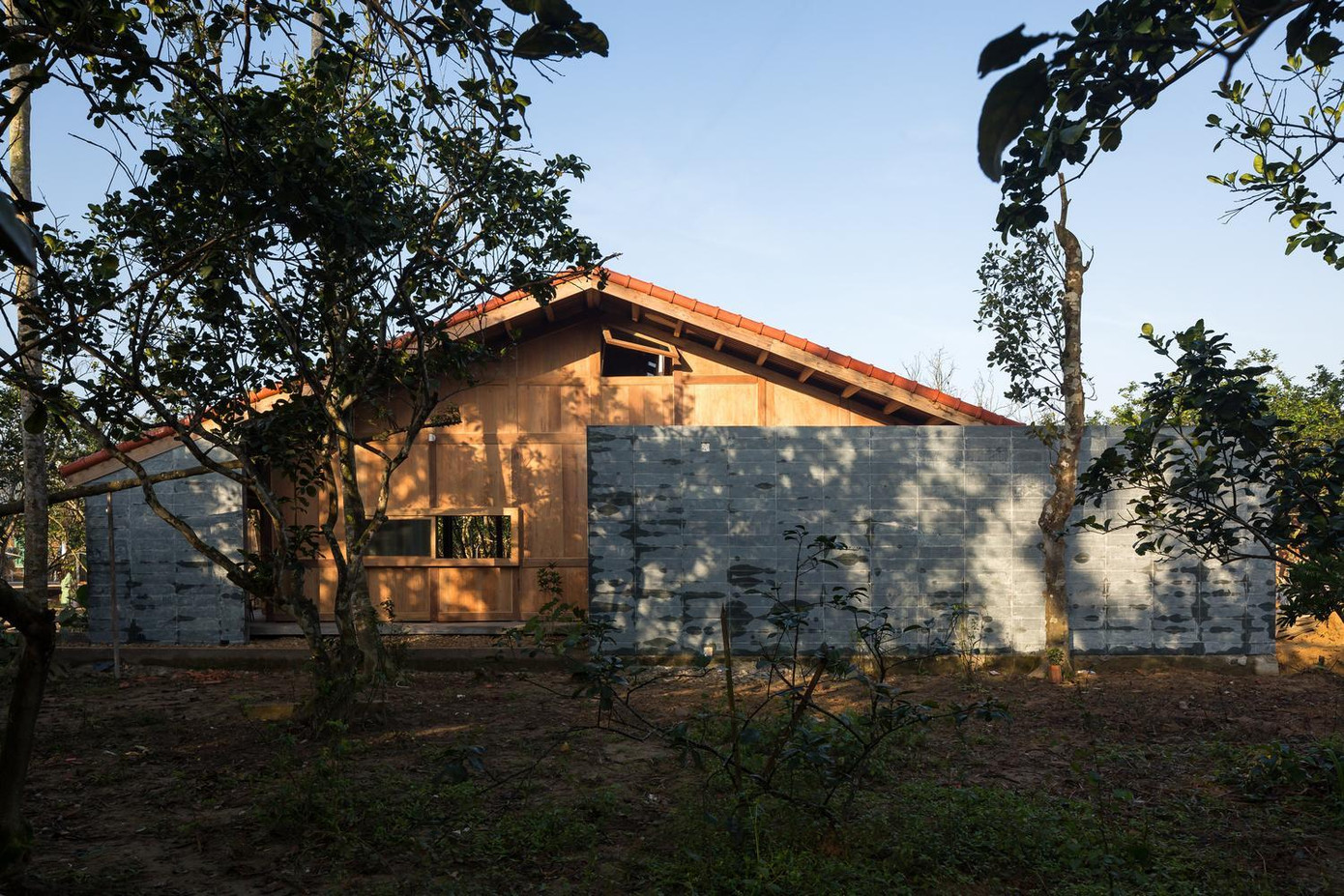 | Khu vực chung bao gồm khu sinh hoạt, ăn uống và bếp nhỏ kết nối với hàng hiên đi dọc theo mặt tiền chính, hướng ra ao hoa súng trước nhà. Có một cây cầu gỗ nhỏ bắc qua ao là lối vào chính của ngôi nhà.  | | Hai phòng ngủ và phòng vệ sinh mang đến sự riêng tư và bầu không khí êm dịu bởi bức tường đá tự nhiên bao bọc xung quanh, tạo ra những khu vườn bên trong cho mỗi không gian. |  | | Gác lửng bằng gỗ được chiếu sáng bởi giếng trời trên mái, đây được coi là thư viện và kho lưu trữ của gia đình. |  | | Tất cả các không gian của ngôi nhà đều được bao phủ bởi một mái dốc lớn đảm bảo che nắng và giúp thích nghi với khí hậu nhiệt đới của khu vực luôn có nhiều ánh nắng gay gắt vào mùa hè và mưa lớn kéo dài như Huế. |  | | Hầu hết đồ nội thất, khung chính và tường của ngôi nhà được làm bằng gỗ nghiến được thu thập từ cấu trúc của các tòa nhà cũ bị phá bỏ. |  | | Các loại đá, gỗ, bê tông, thủy tinh, đất nung, dệt, nước, cây xanh… tạo nên một bảng màu đẹp và đặc sắc cho ngôi nhà. | |